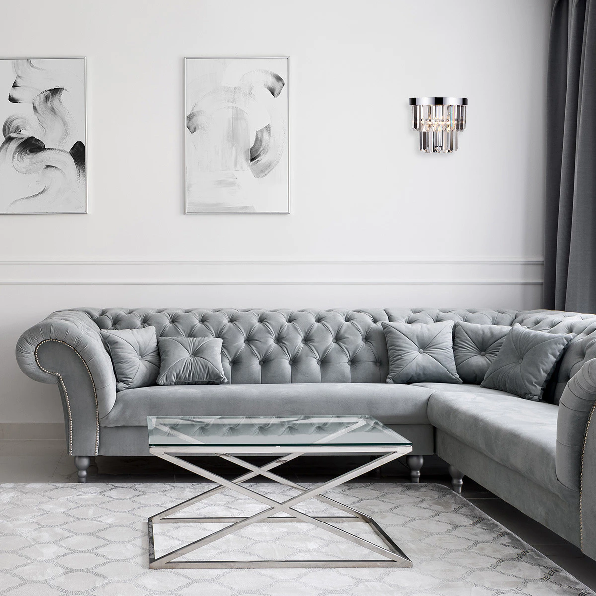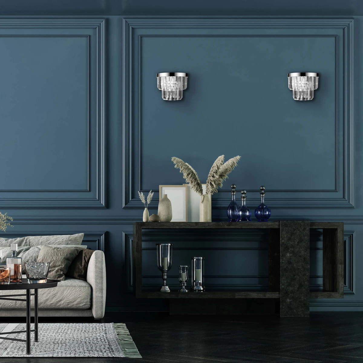 Aplică argintie cu elemente de sticlă colecția Vetro oferă o combinație elegantă între designul contemporan și craftsmanship-ul de înaltă calitate, fiind concepută pentru a transforma orice perete într-un punct focal de lumină și stil. Această lampă de perete creează un efect vizual captivant prin jocul de lumină și umbre generat de elementele de sticlă ce imită cristalele, conferind spațiului un aspect sofisticat și luxos.