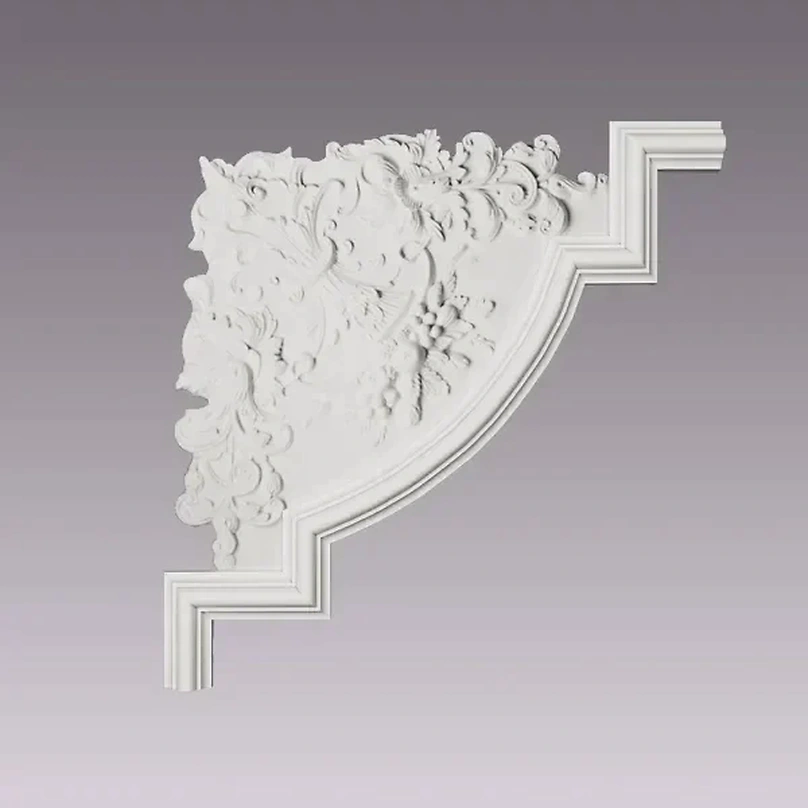 Colțarul decorativ poliuretanic B104-10 cu ornamente florale în relief și finisaj alb aduce eleganță clasică în amenajările interioare moderne.