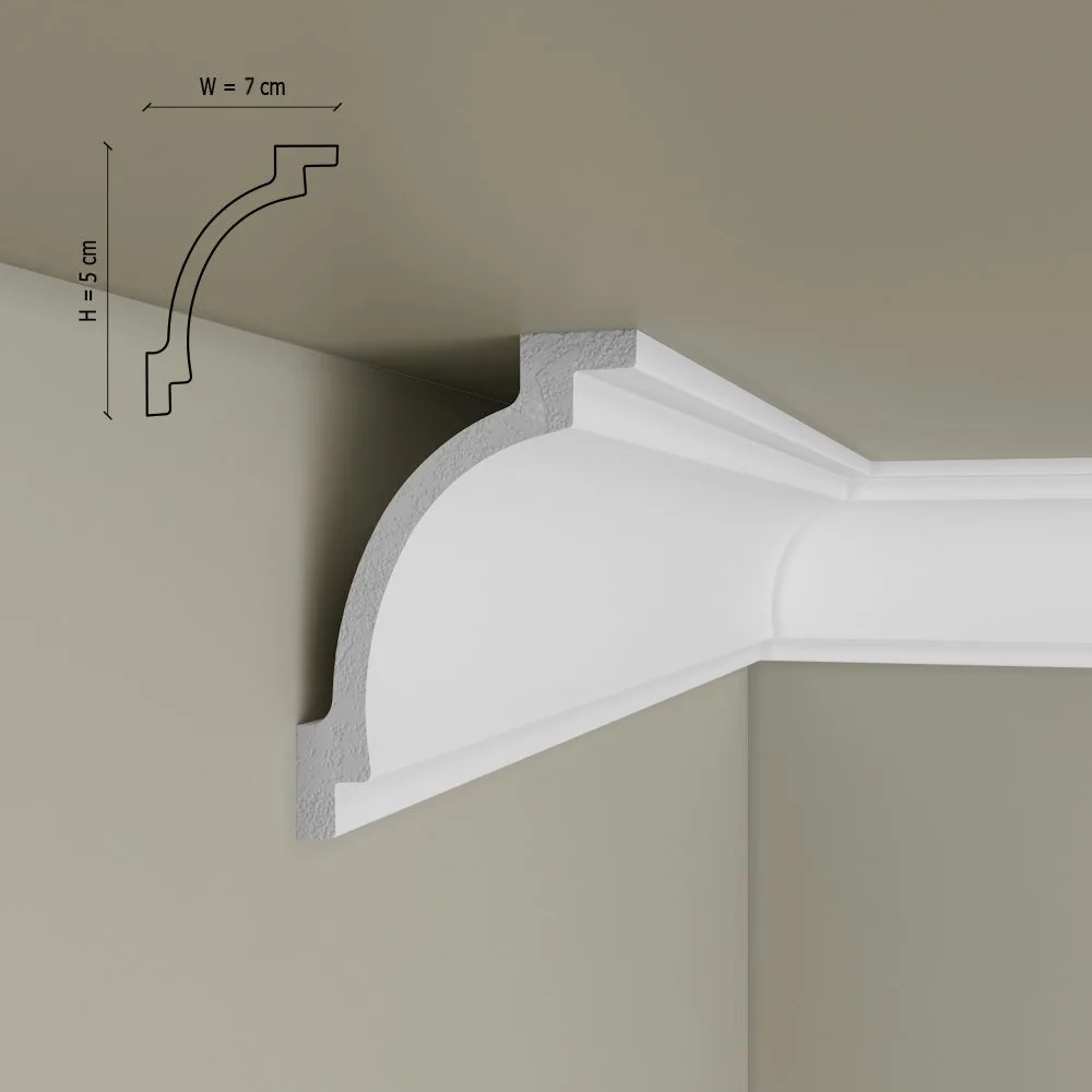 Materialul polimeric special folosit în fabricație asigură o rezistență sporită la uzură și o stabilitate dimensională excelentă în timp. Datorită compoziției sale avansate, cornișa nu se deformează și își păstrează aspectul proaspăt pentru o perioadă îndelungată. Profilul elegant, cu dimensiuni generoase de 50×70 mm, creează un efect vizual puternic pe tavan, definind frumos spațiul și oferind personalitate încăperii.