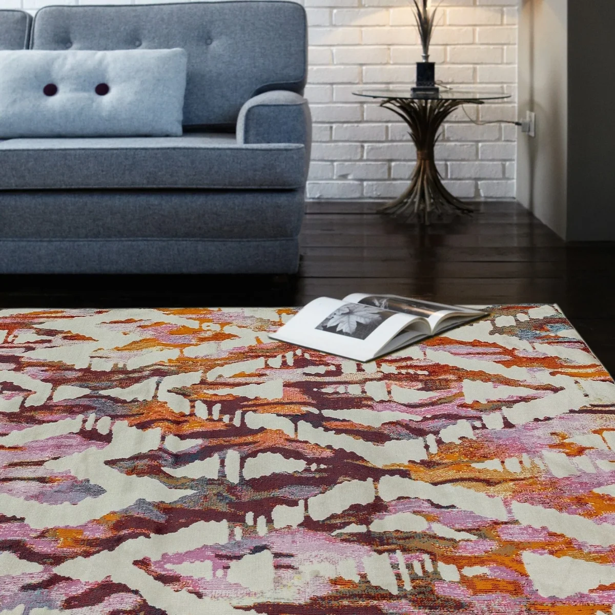 Designul geometric al acestui covor reflectă tendințele actuale în decorațiunile interioare, unde contrastele cromatice și formele abstracte creează puncte focale spectaculoase în living, dormitor sau biroul de acasă. Nuanțele de roz și portocaliu se îmbină armonios cu detalii în maro și crem, oferind versatilitate în asocierea cu mobilierul existent și creând o atmosferă vibrantă, dar echilibrată.