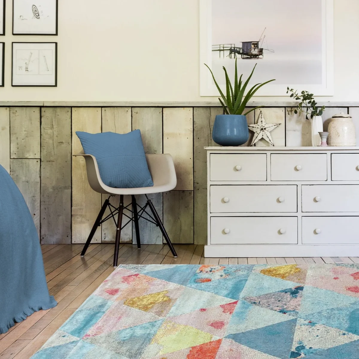 Gama cromatică diversificată permite integrarea acestui covor în multiple stiluri decorative, de la scandinavian modern la eclectic contemporan. Triunghiurile în nuanțe de turcoaz, roz pudrat, galben auriu și coral creează un echilibru vizual ce poate servi ca punct focal într-un living cu mobilier neutru sau poate complementa o cameră de copii cu accente colorate. Dimensiunea de 120×170 cm îl face potrivit pentru spații medii, cum ar fi zona de relaxare din fața televizorului sau camera de joacă.