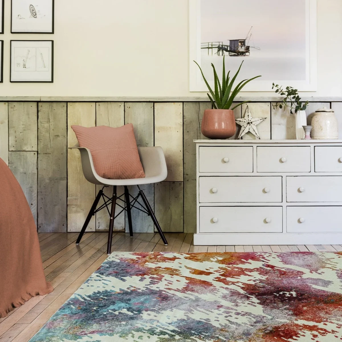 Colecția Amelie de la Asiatic London reprezintă o abordare inovatoare asupra decorului contemporan, unde arta abstractă întâlnește funcționalitatea practică. Designul prezintă o compoziție spontană de culori care evocă tehnicile de pictură expresionistă, cu tranziții fluide între nuanțele de roz pastel, albastru turcoaz, maro ciocolatiu și accente cremă. Această paletă cromatică versatilă se integrează natural în diverse scheme decorative, de la stilul scandinav până la amenajările eclectice sau boho-chic.