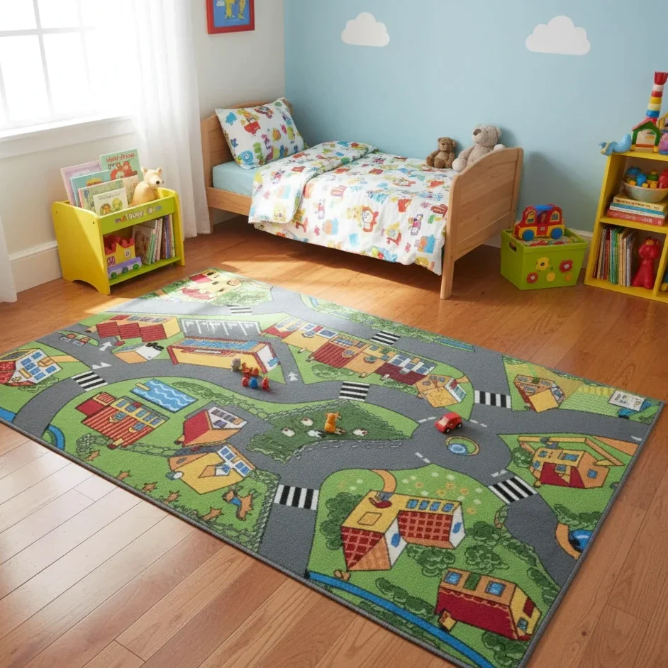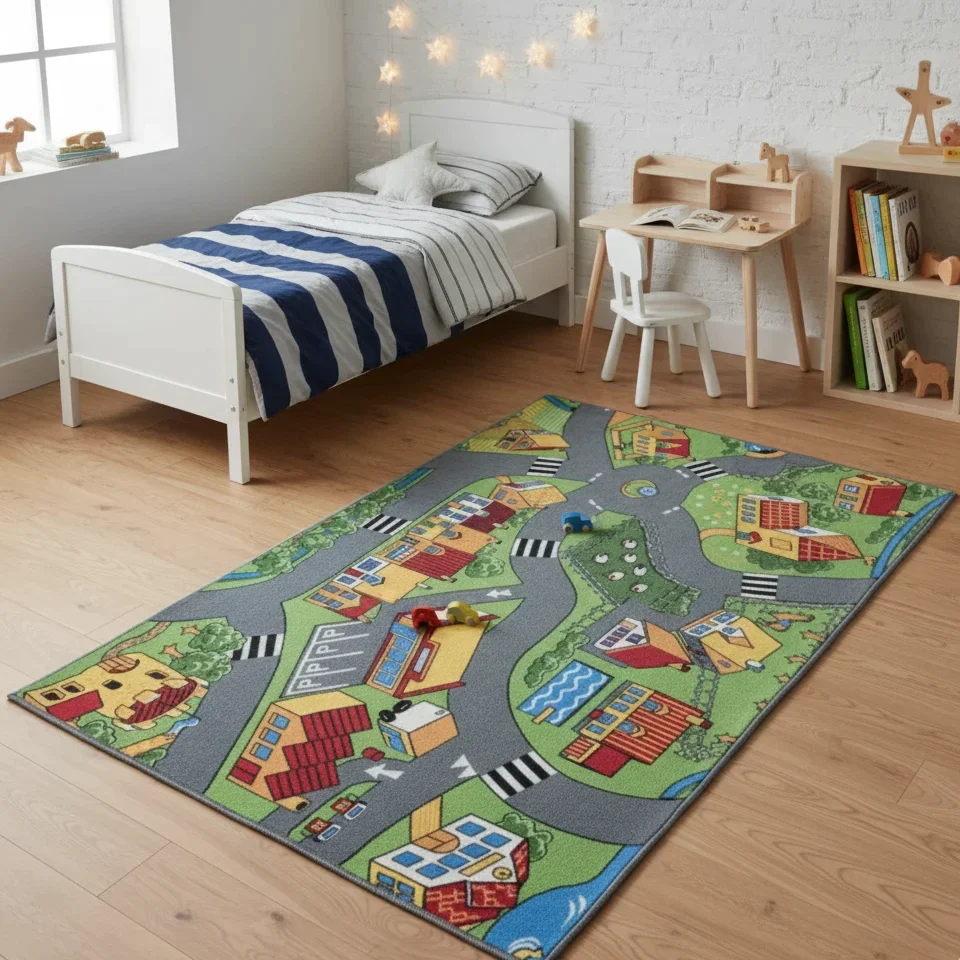 Caracteristici covor pentru copii cu model de oraș anti-alunecare
