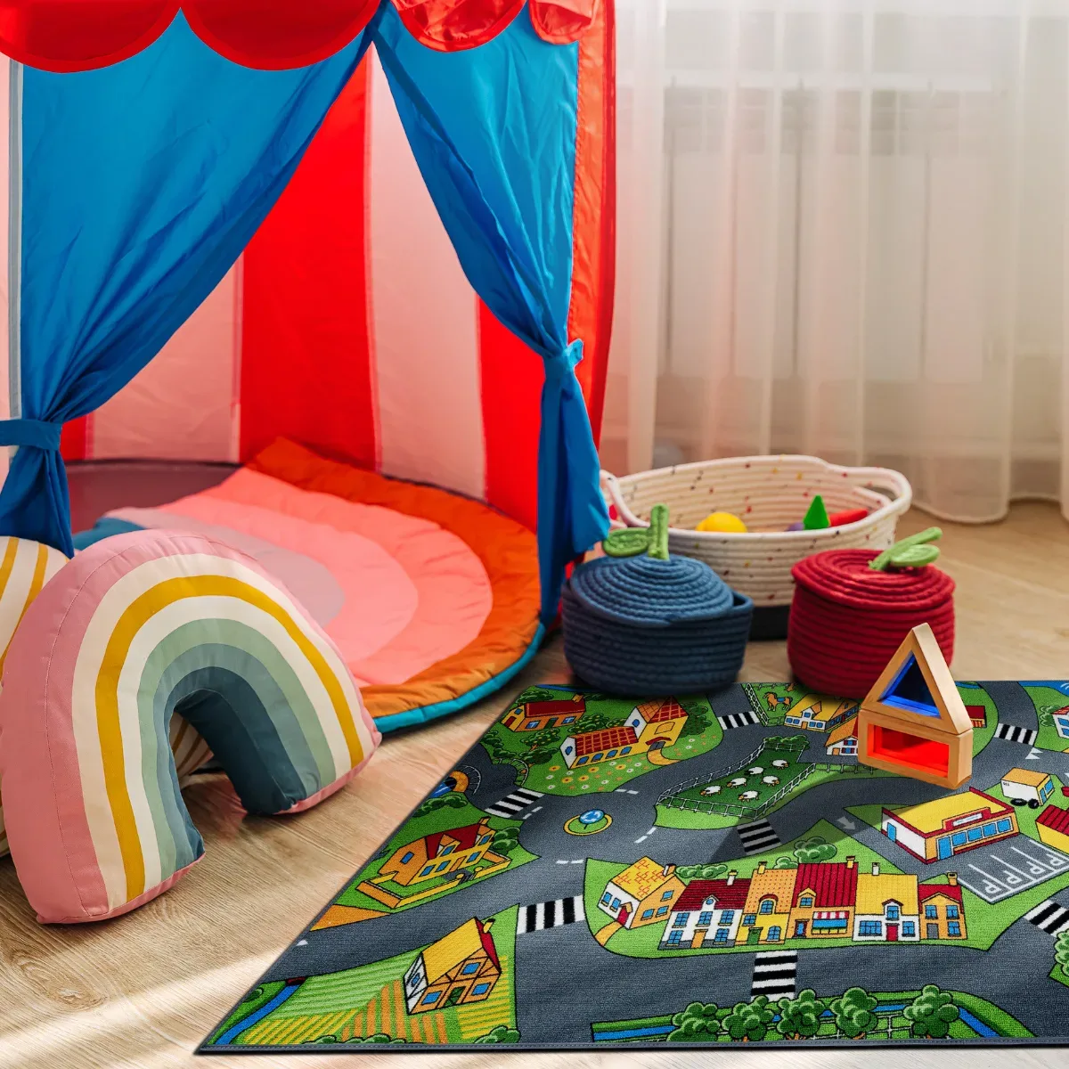 Covorul pentru copii cu model de oraș este soluția pentru părinții care vor să ofere copiilor un mediu de joacă stabil și stimulant și să elimine grija deplasării necontrolate sau a curățării dificile.