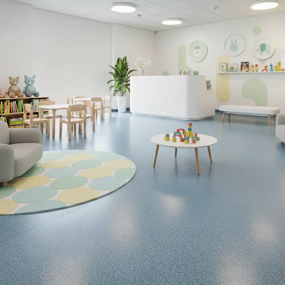 Covorul PVC Eterogen Albastru Smart 121605 Tarkett este alegerea potrivită pentru administratorii de spații comerciale care prioritizează siguranța, igiena și durabilitatea și caută o soluție care combină performanța tehnică cu aspectul estetic plăcut pentru spitale, școli, birouri și centre comerciale. Acest produs răspunde nevoilor specifice ale mediilor cu trafic intens care necesită standarde înalte de igienă.