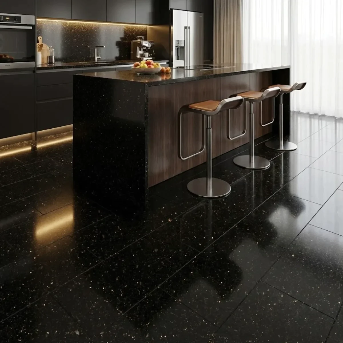 Granit negru lustruit Black Galaxy 61×30.5 cm – placaj natural cu incluziuni sclipitoare argintii care imită constelațiile cerești. Transformă bucătăriile și băile în spații sofisticate cu personalitate unică.