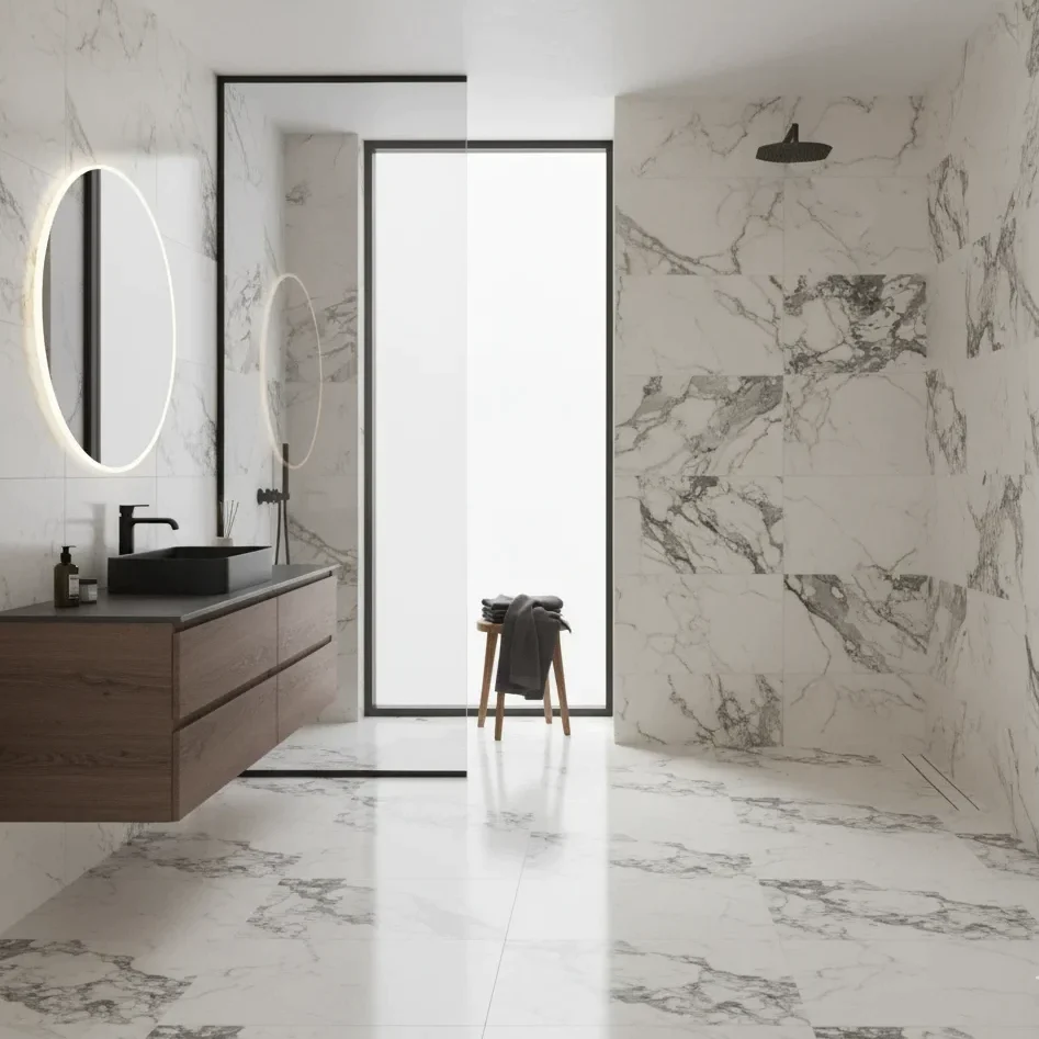 Aceasta gresie are o finisare lucioasa si o textura fina, ceea ce o face sa arate si sa se simta ca marmura naturala. Cu toate acestea, spre deosebire de marmura, aceasta gresie este mult mai usor de intretinut si de curatat, ceea ce o face o alegere excelenta pentru zonele cu trafic intens.
