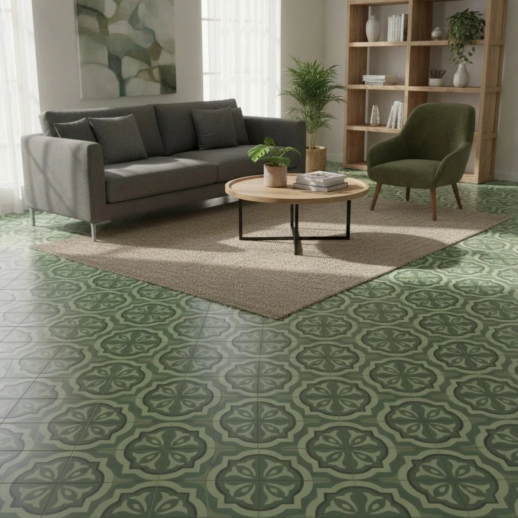 Motivele decorative ale acestei gresii se inspiră din tradiționalele plăci encaustice, dar sunt reinterpretate într-o cheie modernă. Mixul de desene geometrice și floriale creează un ritm vizual echilibrat, perfect pentru a defini zone distincte în spațiile open-space sau pentru a accentua anumite suprafețe. Verde-ul ales nu este nici prea intens, nici prea pal, ci se situează într-o zonă cromatică care se armonizează ușor cu materialele naturale precum lemnul, piatra sau metalele patinate.
