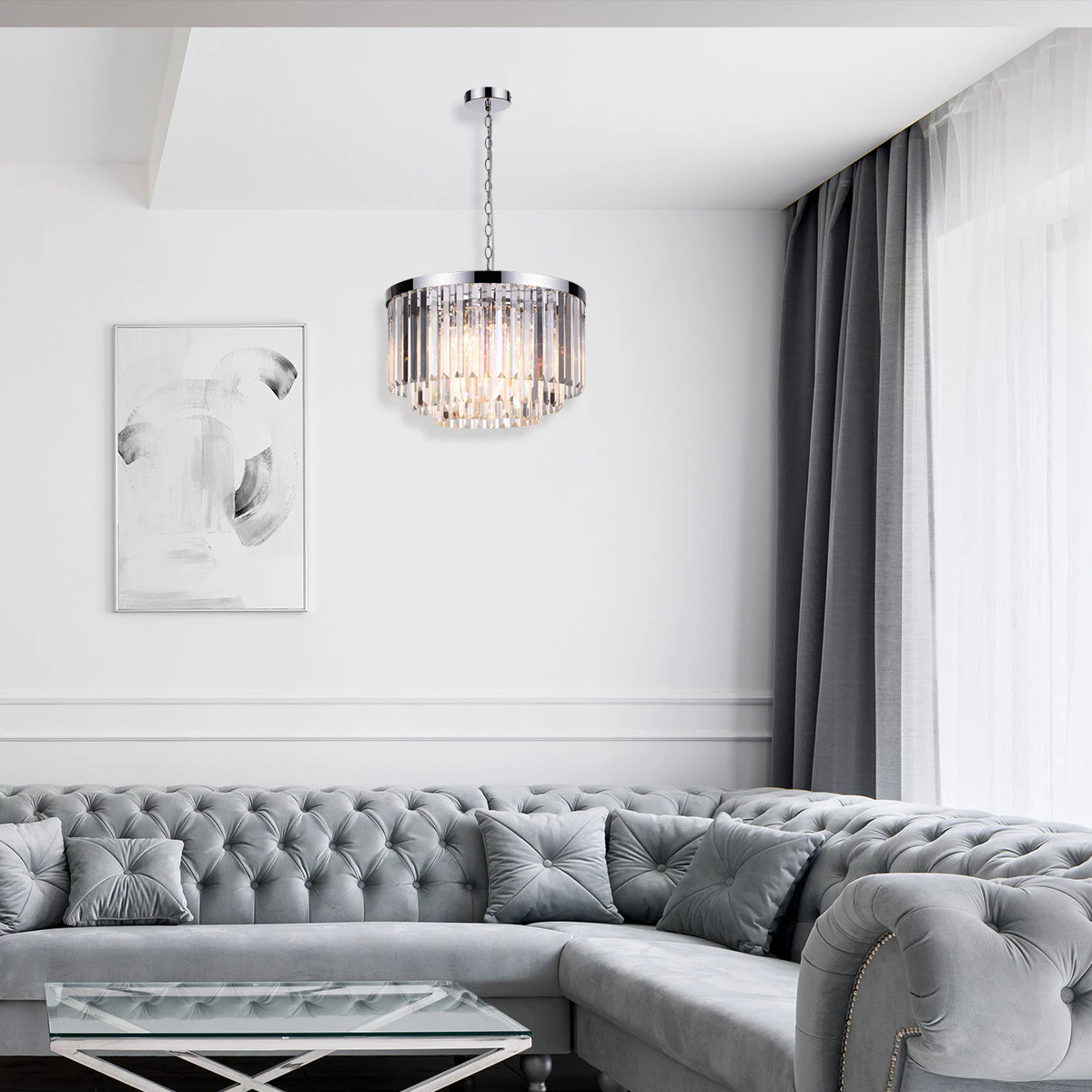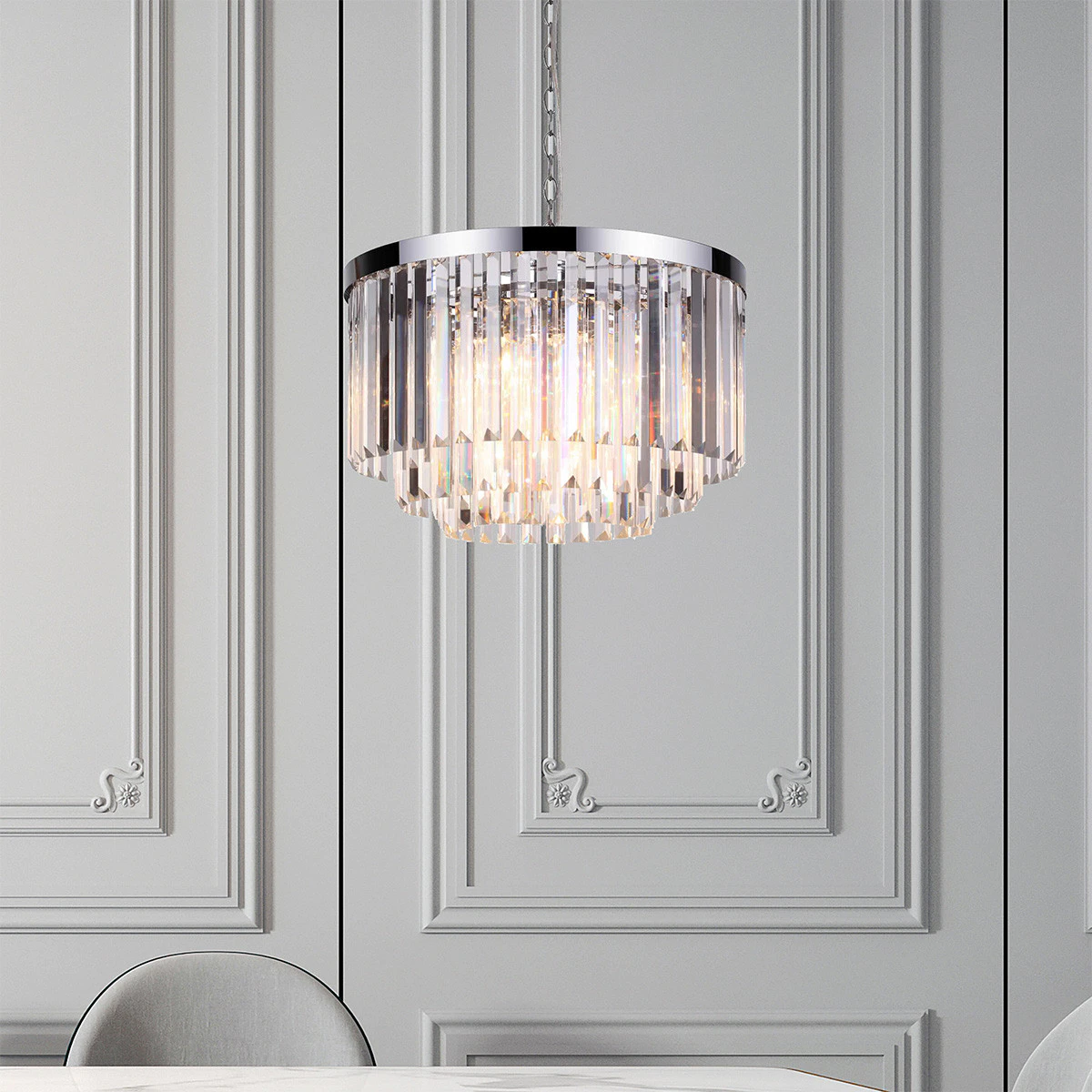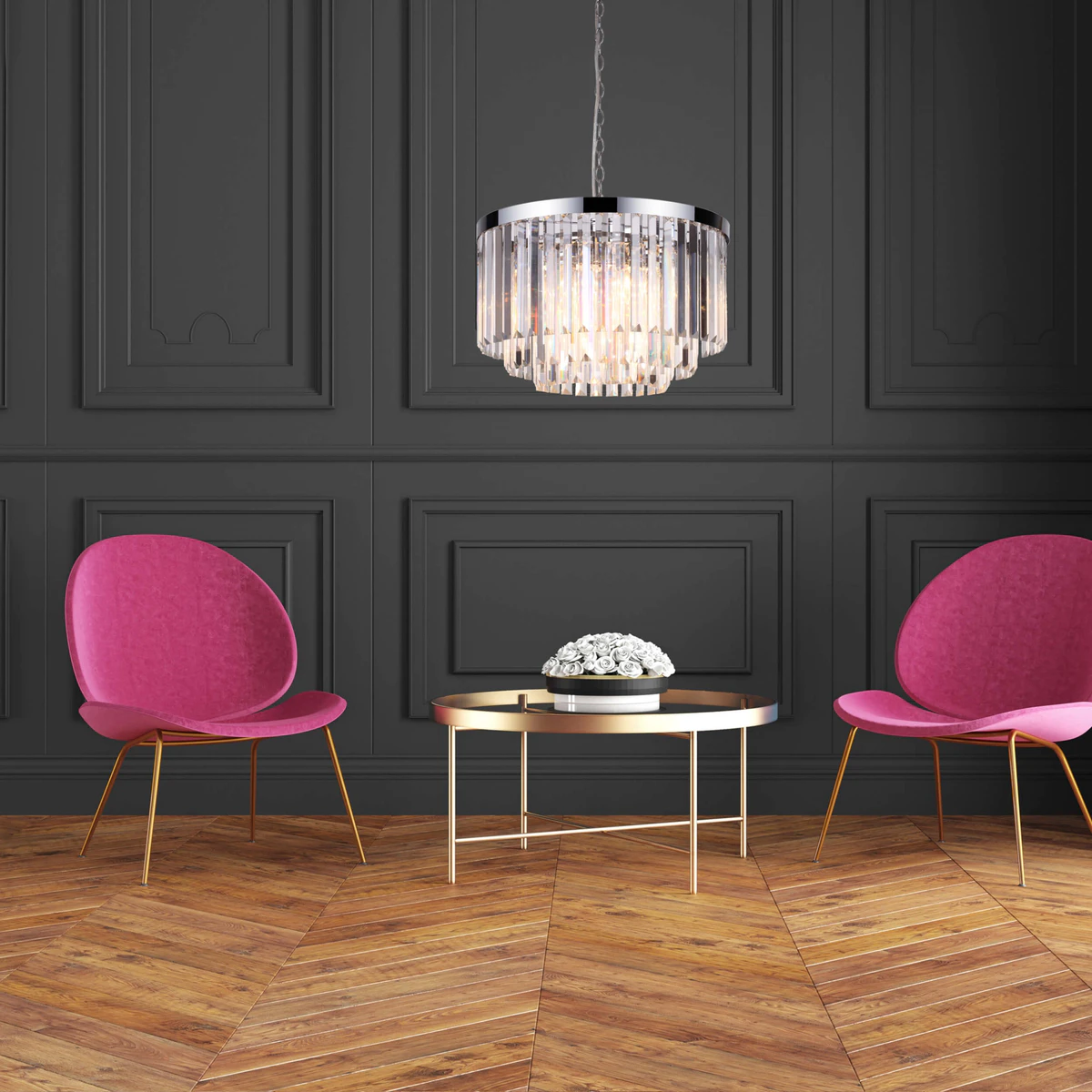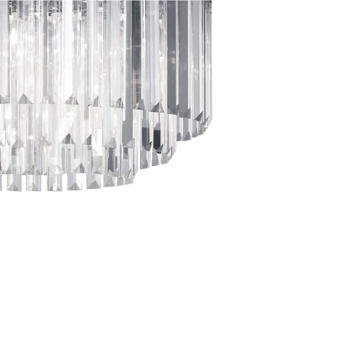 Povestea vizuală a colecției Vetro pornește de la abajurul transparent din sticlă și cadrul metalic argintiu. Cinci becuri tip E14 filtrează lumina printre elementele din sticlă, generând reflexii discrete, fără efecte deranjante. Pentru utilizator, asta înseamnă un corp central care ordonează vizual zona mesei de dining, a insulei de bucătărie sau a unui hol generos, fără a aglomera ambientul. Pentru proiecte comerciale (receptive, săli de evenimente, galerii), piesa devine un reper estetic, ușor de încadrat în schemele de iluminat pe straturi.