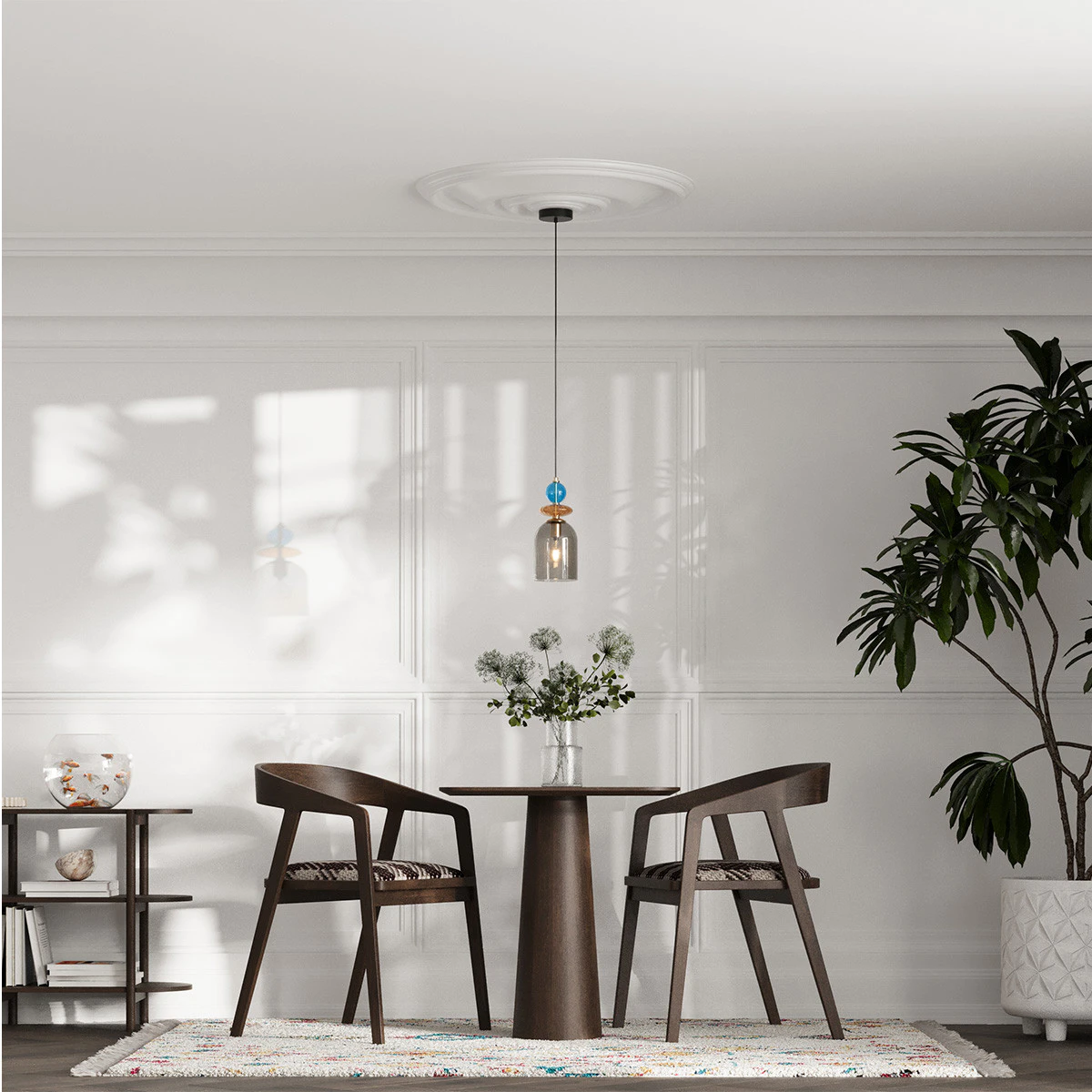 Pentru a maximiza impactul vizual al acestei lămpi suspendate, alege cu atenție înălțimea de montaj în raport cu mobilierul existent. În sufragerie, poziționează lampa la aproximativ 75-85 cm deasupra unei mese de dining pentru a crea o iluminare optimă fără a bloca vizibilitatea. În dormitor, montajul lateral poate transforma lampa într-un element decorativ principal, completând designul general al încăperii.