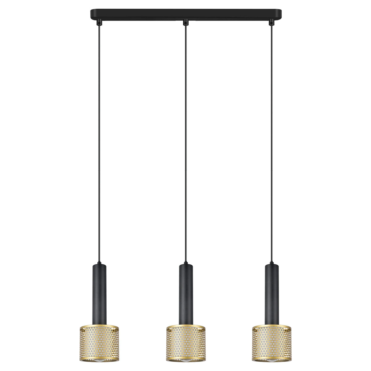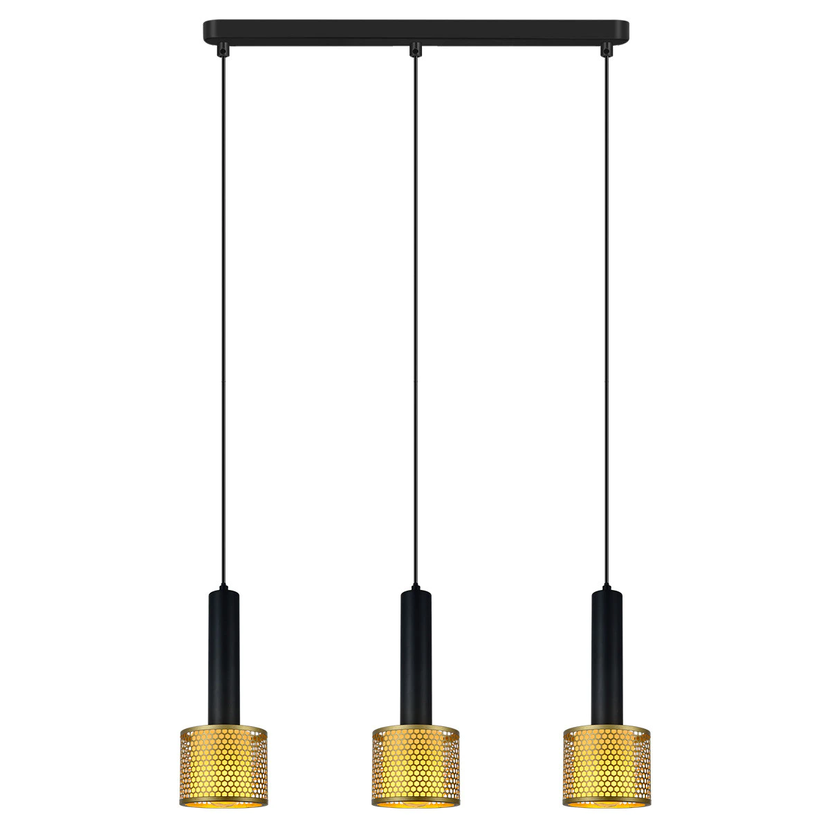 Etichete: lampă suspendată negru aurie trei puncte lumină, iluminat modern bucătărie dining contemporan, abajur traforat metalic design industrial, corpuri iluminat suspendate E27 Light Prestige, soluție iluminare stylish spații generoase, ambient sofisticat lumină caldă living