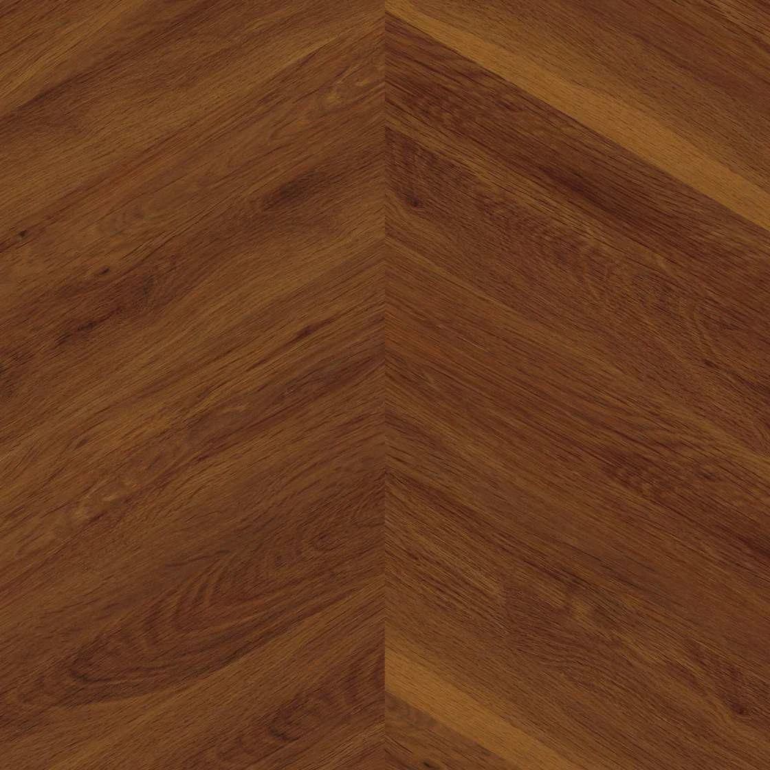 Dimensiunile speciale de 457 x 102 mm și grosimea totală de 2.5mm sunt concepute specific pentru montaj în modelul Chevron – un pattern care diferă de herringbone tradițional prin unghiul de 60° între plăci, creând un efect vizual mai dinamic și mai rafinat. Muchiile tășite pe toate cele patru laturi ale fiecărei plăci creează rosturi discrete care evidențiază individualitatea fiecărui element, similară parchetului masiv autentic. Finisajul stejar mediu prezintă nuanțe calde și naturale, cu variații subtile de ton care recreează fidel caracteristicile lemnului natural, iar textura suprafeței este sincronizată cu designul vizual pentru o senzație plăcută la atingere.