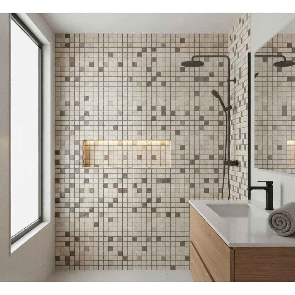 - Mozaicul din marmură poate fi combinat cu alte materiale decorative în aceeași încăpere? Da, acest mozaic se armonizează excelent cu travertinul, granitul în tonuri neutre, ceramica în culori creme sau bej, și chiar cu elementele metalice în finisaj cromat sau nichel. Evită combinarea cu materiale foarte lucioase sau cu texturi foarte diferite care pot crea un contrast vizual prea puternic și pot diminua eleganța naturală a marmuri.