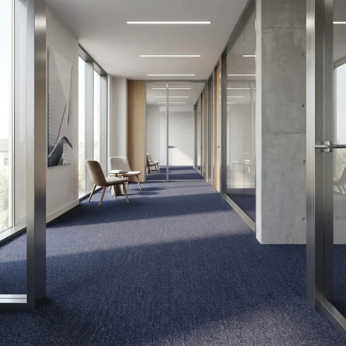 Pardoseala textilă joacă un rol important în ergonomia și ambientul unui spațiu de birou. Mocheta dale Burmatex GOTO aduce un echilibru între aspectul vizual și proprietățile tehnice, contribuind la crearea unui mediu de lucru care este, în același timp, elegant și practic. Nuanta de albastru profund, denumită de producător “deep blue”, conferă o notă de sobrietate și profesionalism. Textura buclată nu doar că adaugă un element tactil, dar asigură și o rezistență deosebită la uzură și la tasare, ceea ce este un aspect esențial în zonele cu un flux constant de oameni, precum holurile, sălile de conferințe sau birourile individuale.