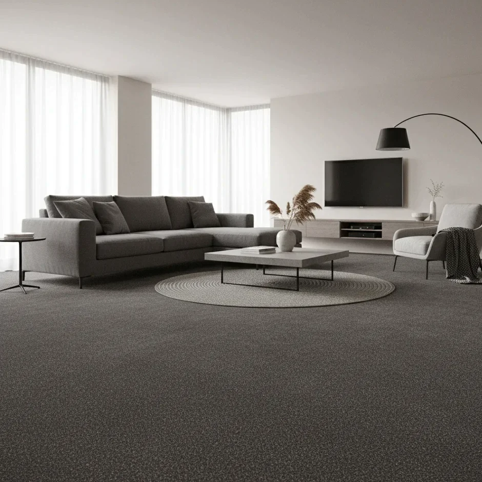 Nuanța de gri închis a acestei mochete funcționează ca o fundație neutră care permite mobilierului și accesoriilor să se remarce. În dormitoarele moderne, se asociază elegant cu lenjerii în tonuri de alb, crem sau bej, creând un contrast subtil care aduce profunzime spațiului. Pentru livinguri, această mochetă constituie baza unei palete cromatice sofisticate, putând fi completată cu perne decorative în nuanțe de turcoaz, mustar sau roz pudrat.