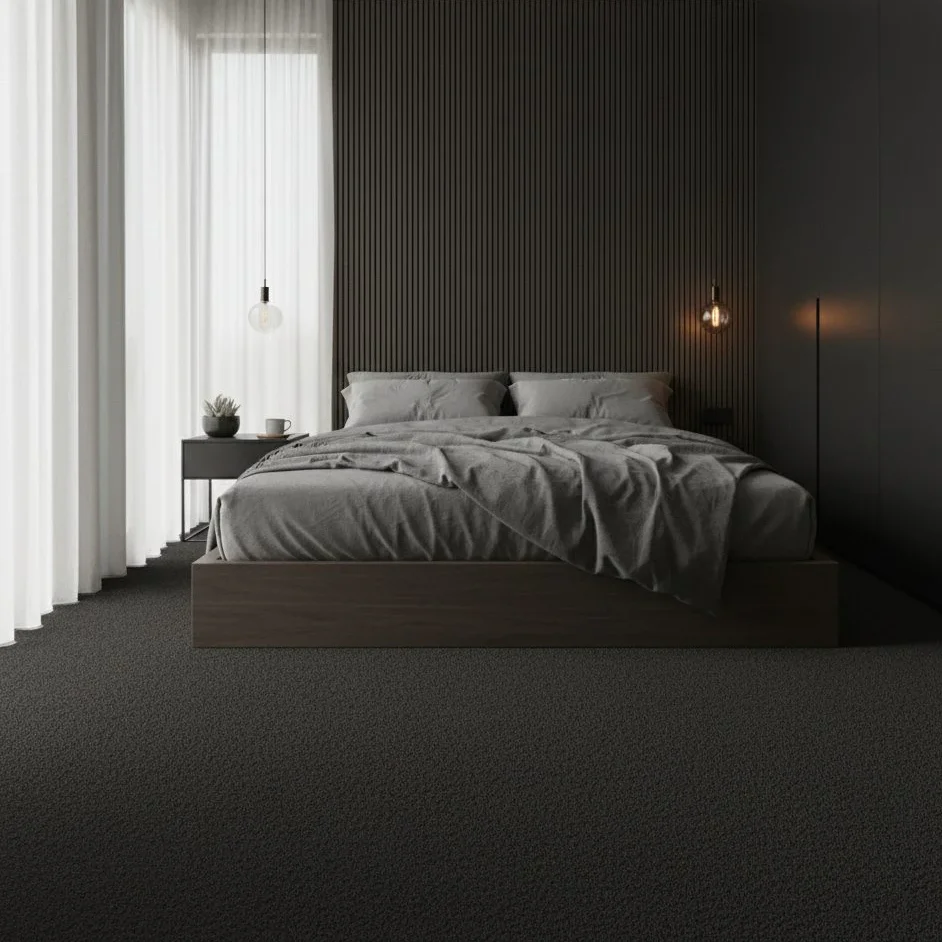 Mochetă neagră se integrează armonios în dormitoare contemporane, unde creează o fundație elegantă pentru mobilierul deschis la culoare. În living-ul modern, textura frisé adaugă o dimensiune tactilă care invită la relaxare, în timp ce proprietățile de izolație fonică transformă camera într-un spațiu de retragere liniștit. Camera de oaspeți beneficiază de căldura vizuală și fizică pe care o oferă această mochetă, creând o primire plăcută pentru vizitatori.