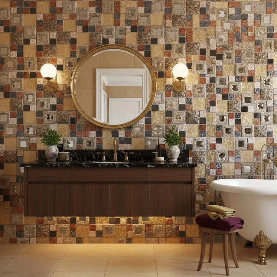 Acest mozaic se potrivește perfect în băile moderne și clasice, creând un accent vizual deosebit în zona dușului sau în spatele chiuvetei. Combinația de culori permite asocierea cu mobilierul din lemn natural, cu accesoriile metalice în finisaj bronz sau cupru, dar și cu elementele contemporane în alb sau gri.