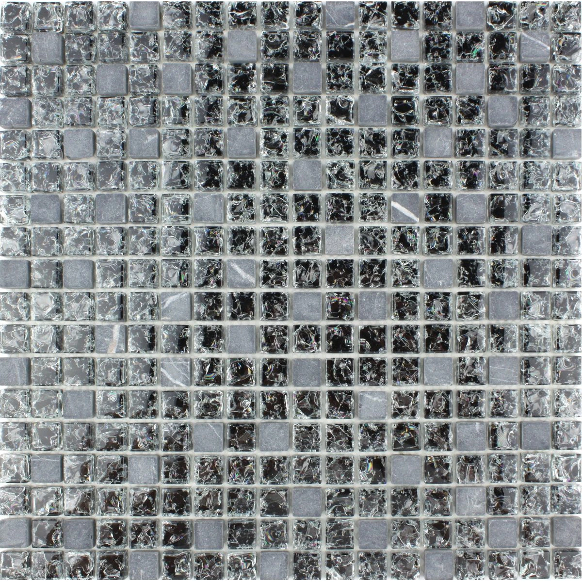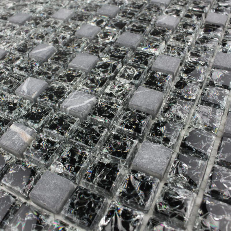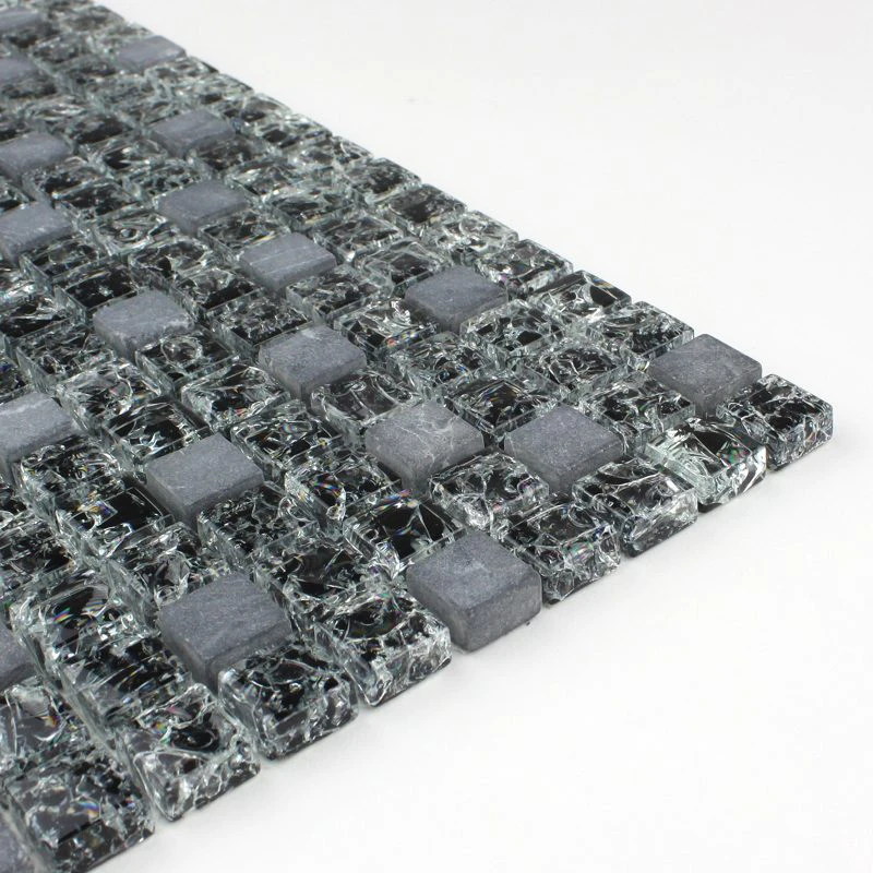 Mozaicul Midas se remarcă prin construcția sa mixtă care îmbină două materiale complementare: sticla cu efect de cristal crăpat și piatra naturală gri. Sticla aduce luminozitate și reflectă lumina ambientală, în timp ce piatra oferă stabilitate cromatică și rezistență la zgârieturi. Pattern-ul checkerboard (tablă de șah) creează o alternare ritmică între piesele transparente și cele opace, generând un efect vizual dinamic care nu devine monoton în timp. Grosimea de 8 mm asigură rezistența structurală necesară pentru montaj pe pereți și pardoseli, fără a adăuga greutate excesivă. Plăcile de 300×300 mm vin premontate pe plasă flexibilă, ceea ce accelerează procesul de instalare și garantează distanța uniformă între piese. Fiecare cutie conține 11 plăci care acoperă aproximativ 1 metru pătrat, facilitând calculul cantității necesare pentru proiect.
