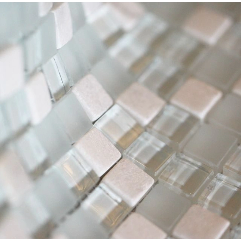 Acest mozaic se remarcă prin construcția sa din două tipuri de materiale complementare: sticlă temperată cu finisaj lucios și piatră naturală cu suprafață mată. Contrastul dintre texturi generează un efect tridimensional subtil, vizibil mai ales în condiții de lumină laterală sau naturală variabilă. Placuțele de 14×14 mm sunt montate pe plasă de suport rezistentă, care permite flexibilitate la aplicare și facilitează tăierea pentru adaptarea la colțuri sau contururi neregulate.