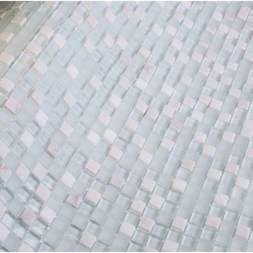 Mozaicul din sticlă și piatră alb Midas aduce un echilibru perfect între lumină și textură în amenajările moderne, fiind conceput special pentru băi, bucătării și zone spa unde puritatea vizuală și rezistența la umiditate sunt esențiale. Combinația de placuțe din sticlă translucidă și piatră albă opacă creează un pattern irregular care captează și reflectă lumina naturală, amplificând senzația de spațiu și luminozitate. Acest mozaic răspunde nevoii de finisaje elegante și practice, potrivit pentru proprietarii care caută soluții durabile fără compromisuri estetice.