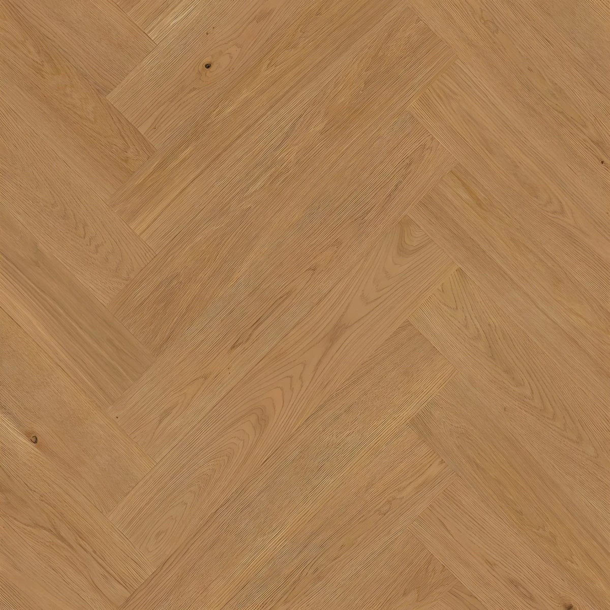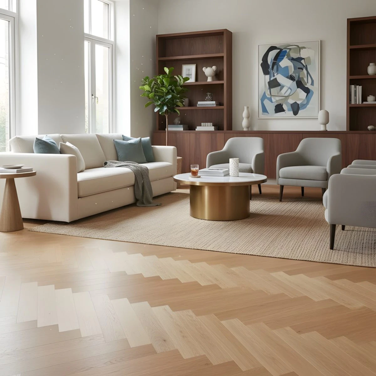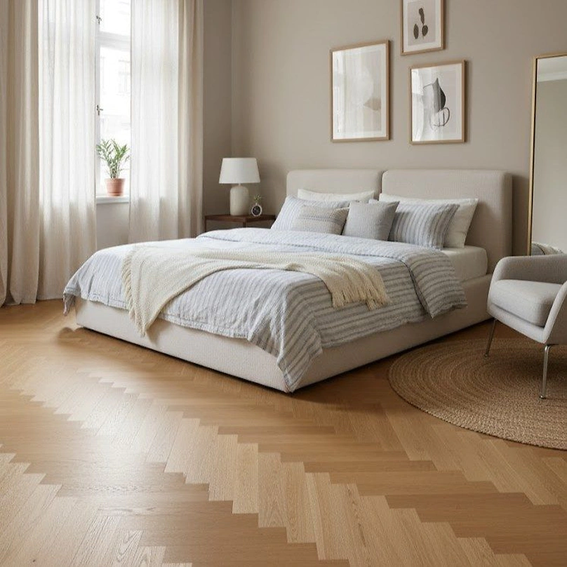 Parchet dublu stratificat din stejar lac transparent cu finisaj periat și lac mat, așezat în model herringbone clasic, combină eleganța scandinavă cu durabilitatea premium. Stratul superior de 3,5 mm din lemn masiv permite recondiționări viitoare, prelungind durata de viață cu decenii, ideal pentru familiile care își doresc o pardoseală autentică rezistentă la uzura zilnică.
