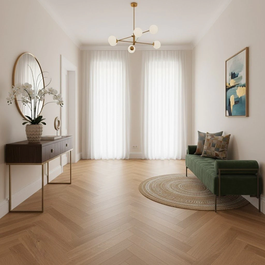 Fiecare spațiu își poate găsi personalitatea cu acest tip de parchet. Într-un apartament modern, montajul în spic al plăcilor de 10x70x470 mm creează o iluzie de volum și aduce o notă distinctă de rafinament. Într-o cafenea, zona de recepție sau un birou elegant, textura uniformă și culoarea caldă a stejarului Select asigură atât confort vizual, cât și o atmosferă primitoare.
