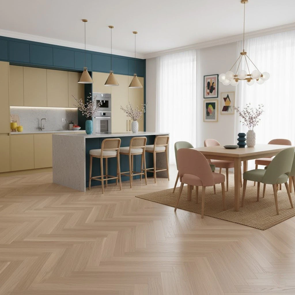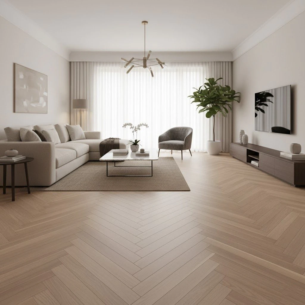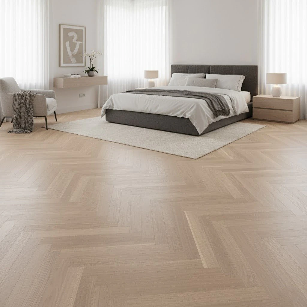 În designul interior contemporan, parchetul herringbone este recunoscut pentru efectul de spațiu lărgit și modul elegant în care pune în valoare textura lemnului. Nuanțele albe, împreună cu desenul natural al stejarului, adaugă profunzime și dinamism, fiind apreciate atât de arhitecți cât și de proprietarii care urmăresc un stil minimalist sau nordic.
