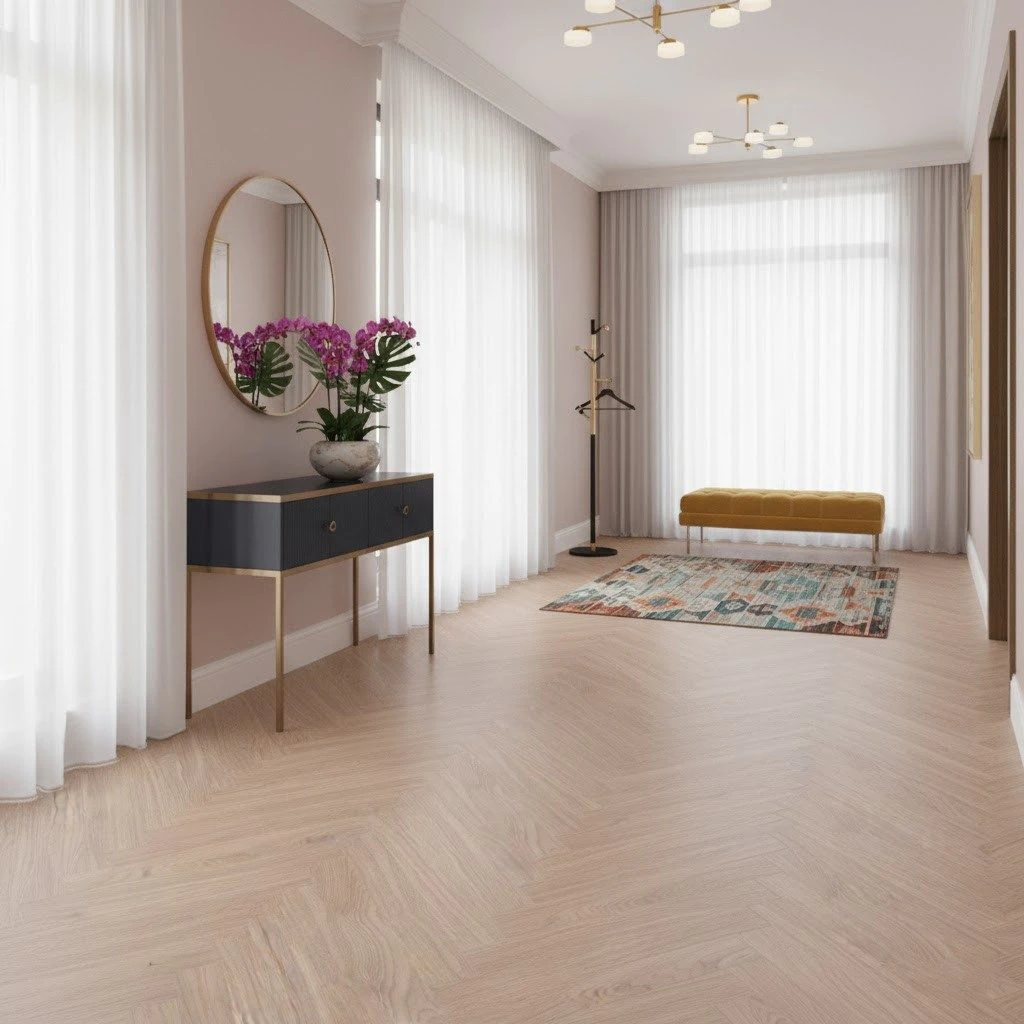Etichete: parchet stejar albit, parchet chevron nordic, pardoseală Boen premium, finisaj lacuit mat, stejar dublu stratificat, design interior scandinav