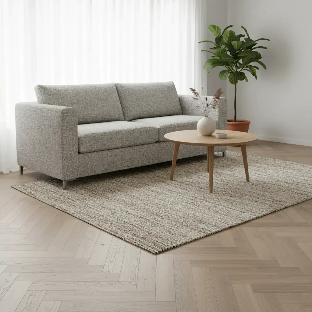 Parchetul laminat herringbone maro-cenușiu cu nervuri fine de stejar bej este soluția pentru cei care vor să obțină un interior sofisticat și modern, cu aspect de lemn natural, și să elimine grija legată de durabilitatea și întreținerea complexă a pardoselii.