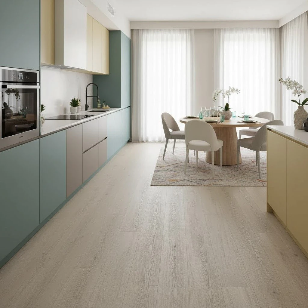 … Răspuns: Nu, structura compozită a parchetului SPC Stejar Brandon Oak este 100% impermeabilă. Spre deosebire de parchetul laminat sau de cel din lemn, acest material nu absoarbe apa și nu se va umfla, deforma sau deteriora în medii cu umiditate ridicată. Din acest motiv, este o soluție special concepută pentru a fi instalată în bucătării și băi, garantând o durabilitate crescută în aceste spații.