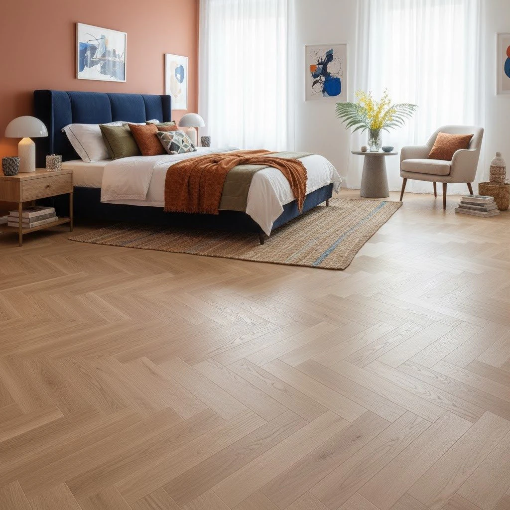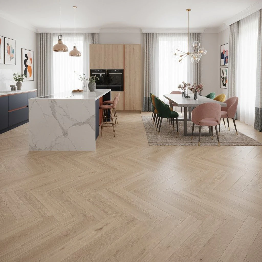 Acest parchet SPC stejar natural herringbone mat din colecția Royal Castle Louvre de la VinylTechLab este o soluție de pardoseală avansată, proiectată pentru a combina estetica clasică a modelului herringbone cu performanța tehnologică modernă. Nucleul său rigid SPC și stratul de uzură de 0.55 mm îl fac potrivit pentru spații rezidențiale cu trafic intens și zone comerciale cu trafic mediu.