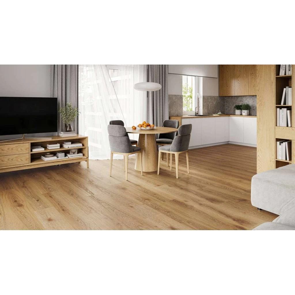 Stratul superior prezinta un finisaj sincron care reproduce cu fidelitate textura si desenul natural al lemnului de stejar, inclusiv nodurile si venele caracteristice. Suprafata antiderapanta asigura siguranta la fiecare pas, in timp ce structura stratificata ofera o rezistenta exceptionala la trafic intens.