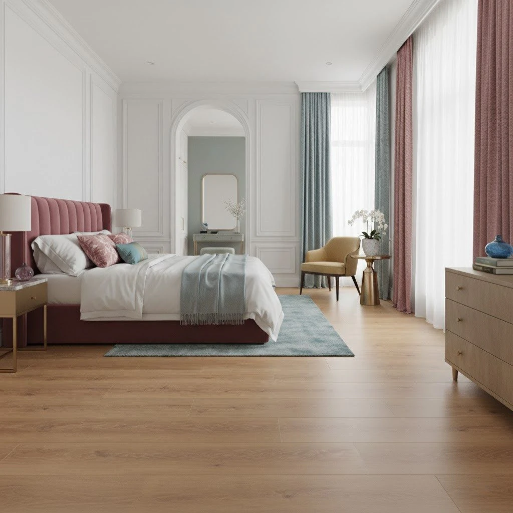 Formatul XL al plăcilor (228 x 1828 mm) creează o senzație de spațiu amplu și deschis, punând în valoare frumusețea designului. Spre deosebire de parchetul laminat tradițional, acest parchet SPC este complet rezistent la apă, putând fi instalat fără probleme în băi sau bucătării, respectând instrucțiunile specifice de etanșare perimetrală.