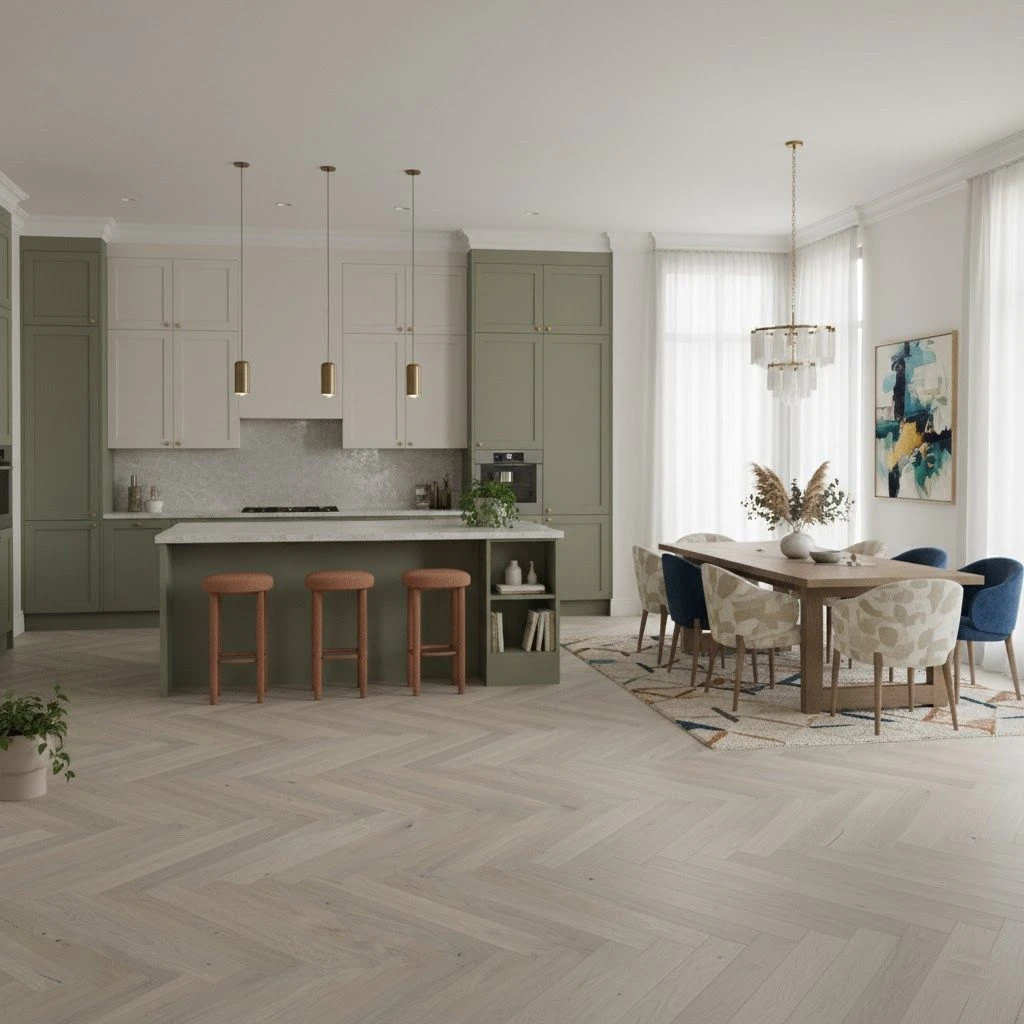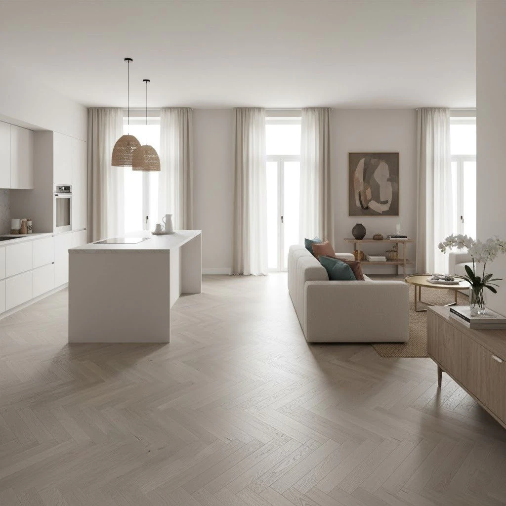 Nu mai asteptati! Comandati acum parchetul stratificat stejar lac mat gri Barlinek Marzipan Muffin Herringbone si transformati-va locuinta intr-un spatiu elegant si confortabil!