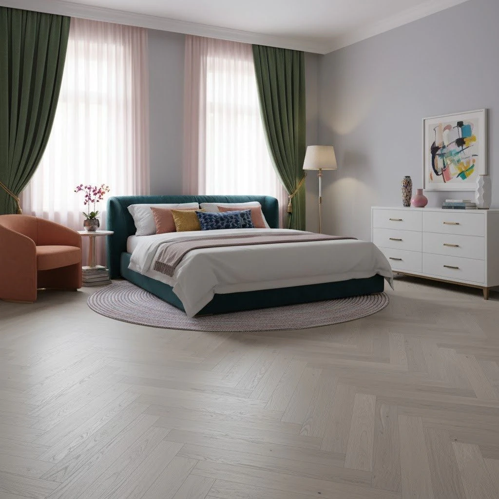 Este o pardoseala formata din trei straturi de lemn, dintre care cel superior este din stejar de cea mai buna calitate, vopsit in tonuri de cenusiu si acoperit cu lac mat. Stratul de uzura are o grosime de 2,5 mm, ceea ce asigura o durabilitate ridicata a produsului. Parchetul are un design clasic in forma de heringbone, care confera un aspect distins si rafinat oricarui interior. Marginile placilor sunt tesite pe toate cele patru laturi, pentru a crea un efect vizual de subtiere si eleganta.