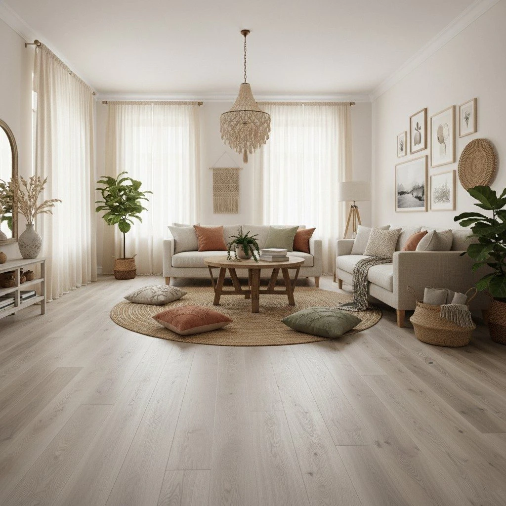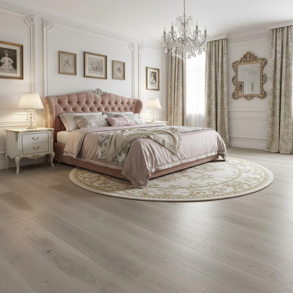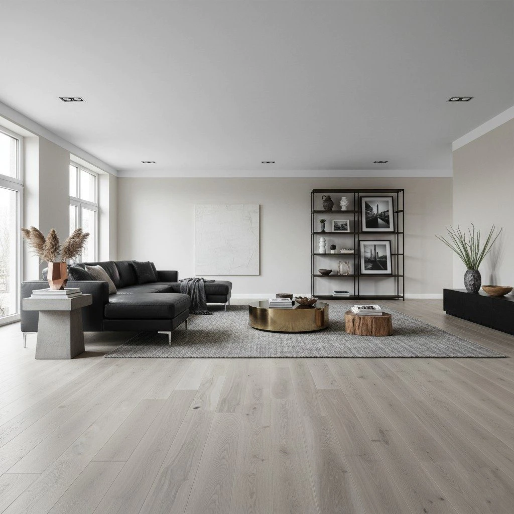 Răspuns: Nuanța de gri a acestui parchet este una deschisă, luminoasă, cu subtonuri calde, specifice lemnului de frasin. Această paletă cromatică ajută la reflectarea luminii naturale, creând senzația unui spațiu mai mare și mai aerisit. Departe de a crea o atmosferă rece, acest parchet oferă o bază neutră și elegantă, care poate fi “încălzită” cu ușurință prin elemente de decor, textile și mobilier în culori vibrante sau texturi naturale.