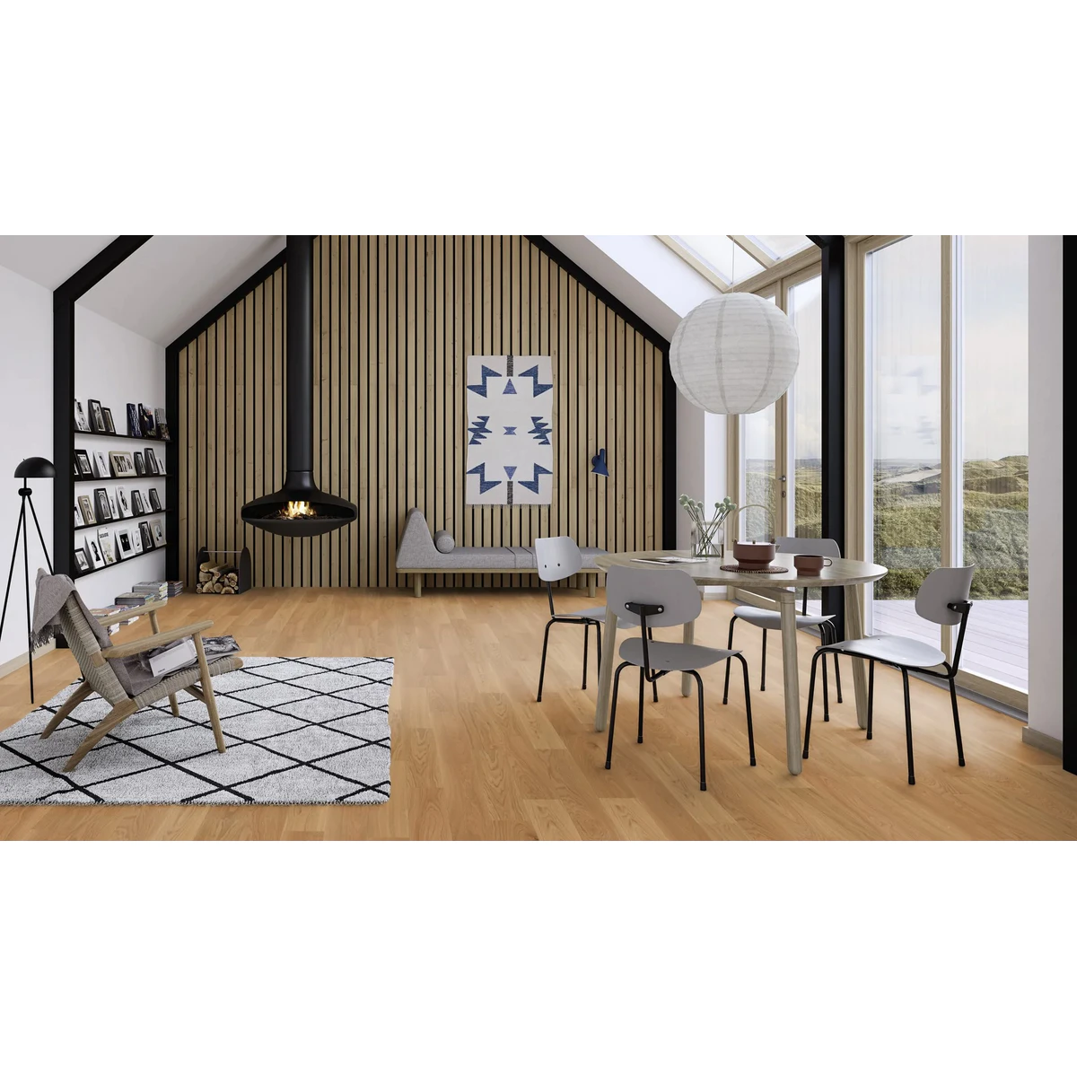 Parchetul din stejar Oak Adagio de la Boen este realizat cu mare atenție la detalii, oferind o combinație între calitatea superioară și estetica deosebită. Structura triplu stratificată asigură stabilitate dimensională excelentă, reducând riscul de deformare sau contractare sub influența variațiilor de temperatură și umiditate. Stratul superior din lemn masiv de stejar, cu grosimea de 3.5 mm, permite renovarea suprafeței de mai multe ori, asigurând astfel o durată lungă de utilizare.