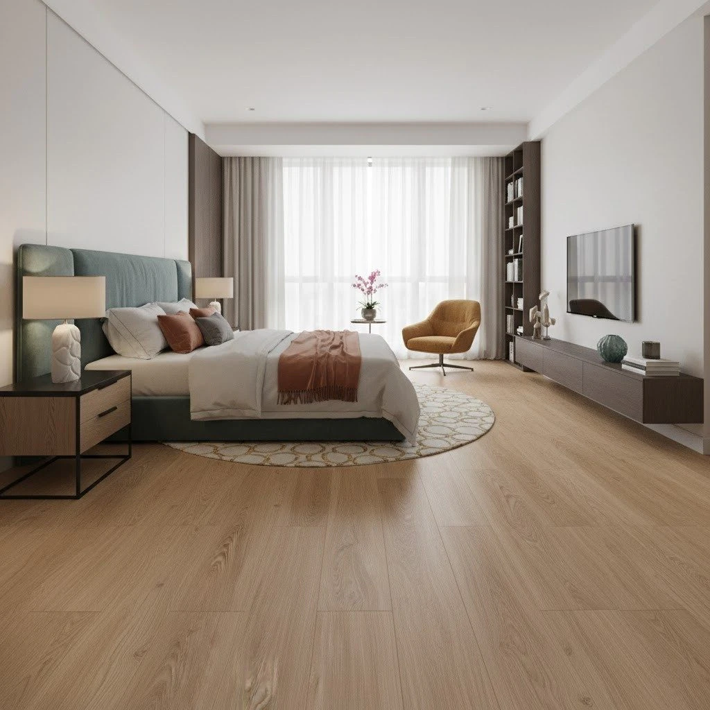 În tendințele actuale de design interior, care favorizează materialele practice, dar cu aspect natural, acest vinil click se distinge prin finisajul său mat elegant. Spre deosebire de parchetul laminat clasic, oferă o senzație mai caldă la atingere și reduce zgomotul pașilor datorită substratului IXPE integrat.