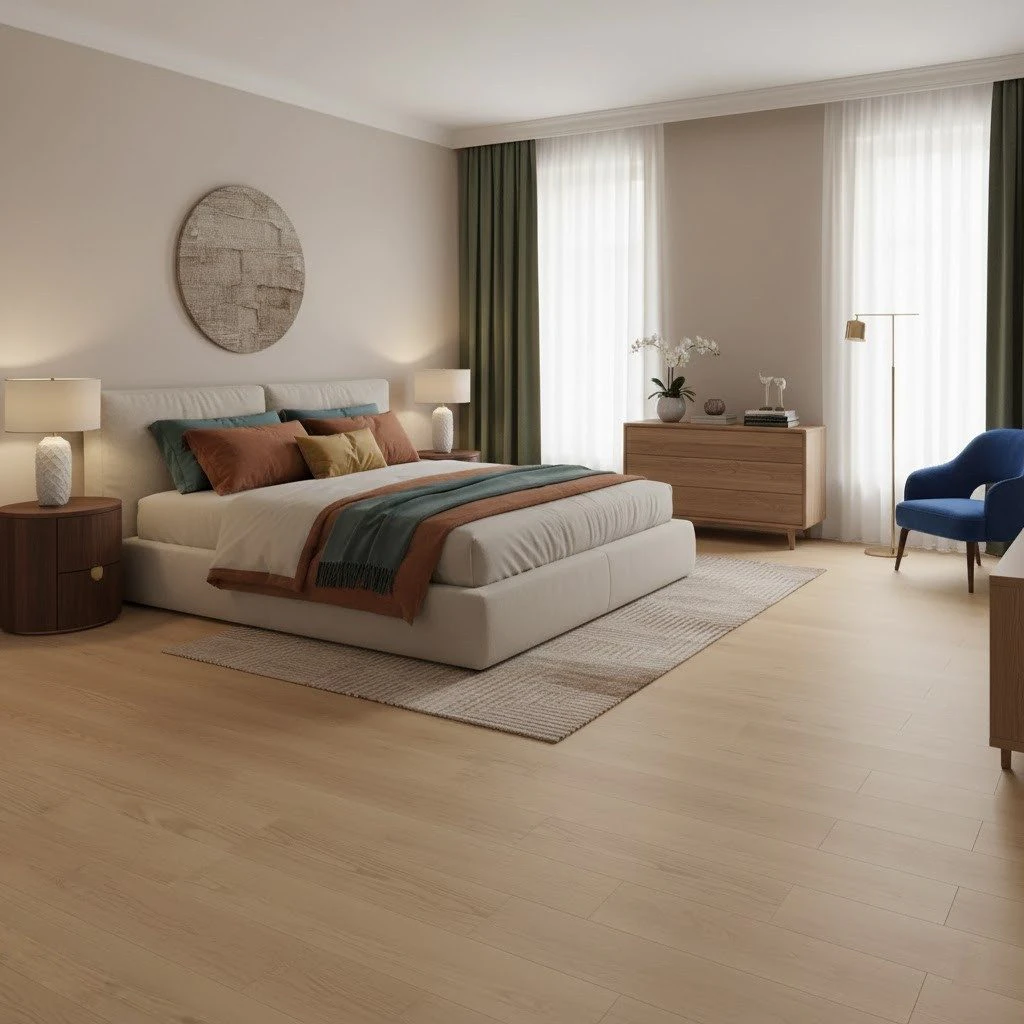 Un lucru ce te bucură la această pardoseală este că include micro-caneluri transparente care adaugă autenticitate și profunzime designului. Te vei surprinde admirând detaliile subtile care imită lemnul natural, în timp ce te bucuri de ușurința întreținerii specifică materialelor moderne.