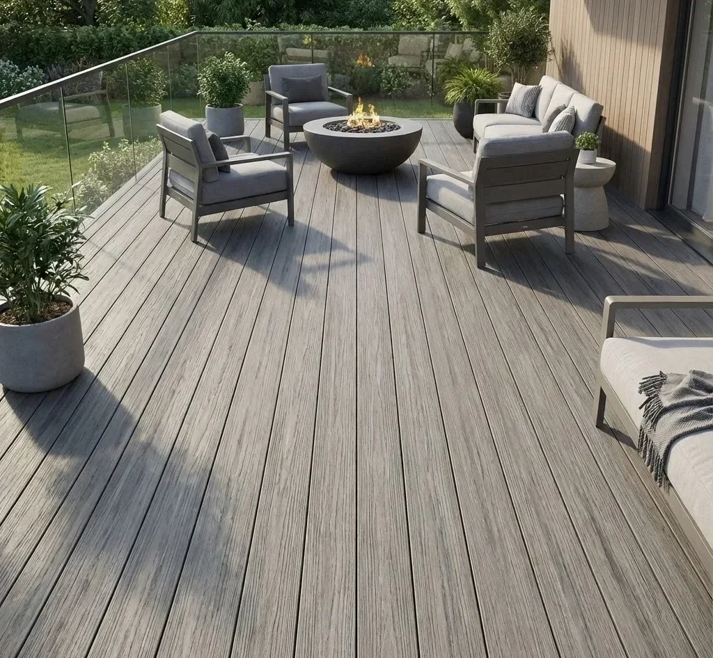 Etichete: plăci deck WPC, terasă exterioară, pardoseală exterioară, material compozit, deck gri lemn