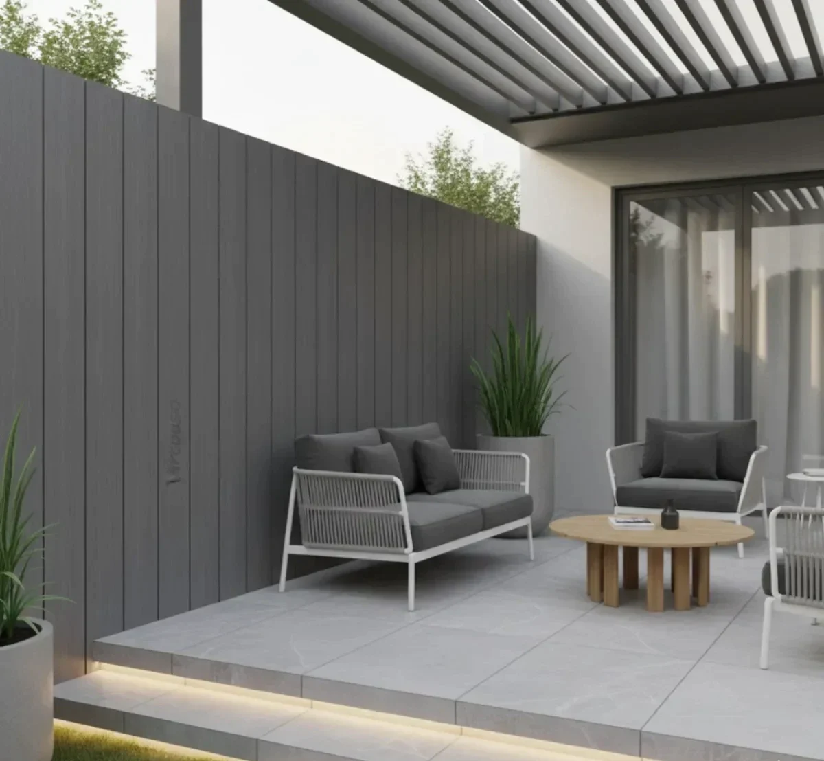 Etichete: gard WPC, lemn compozit, placa gard gri, textura periata, gard modern, gard rezistent