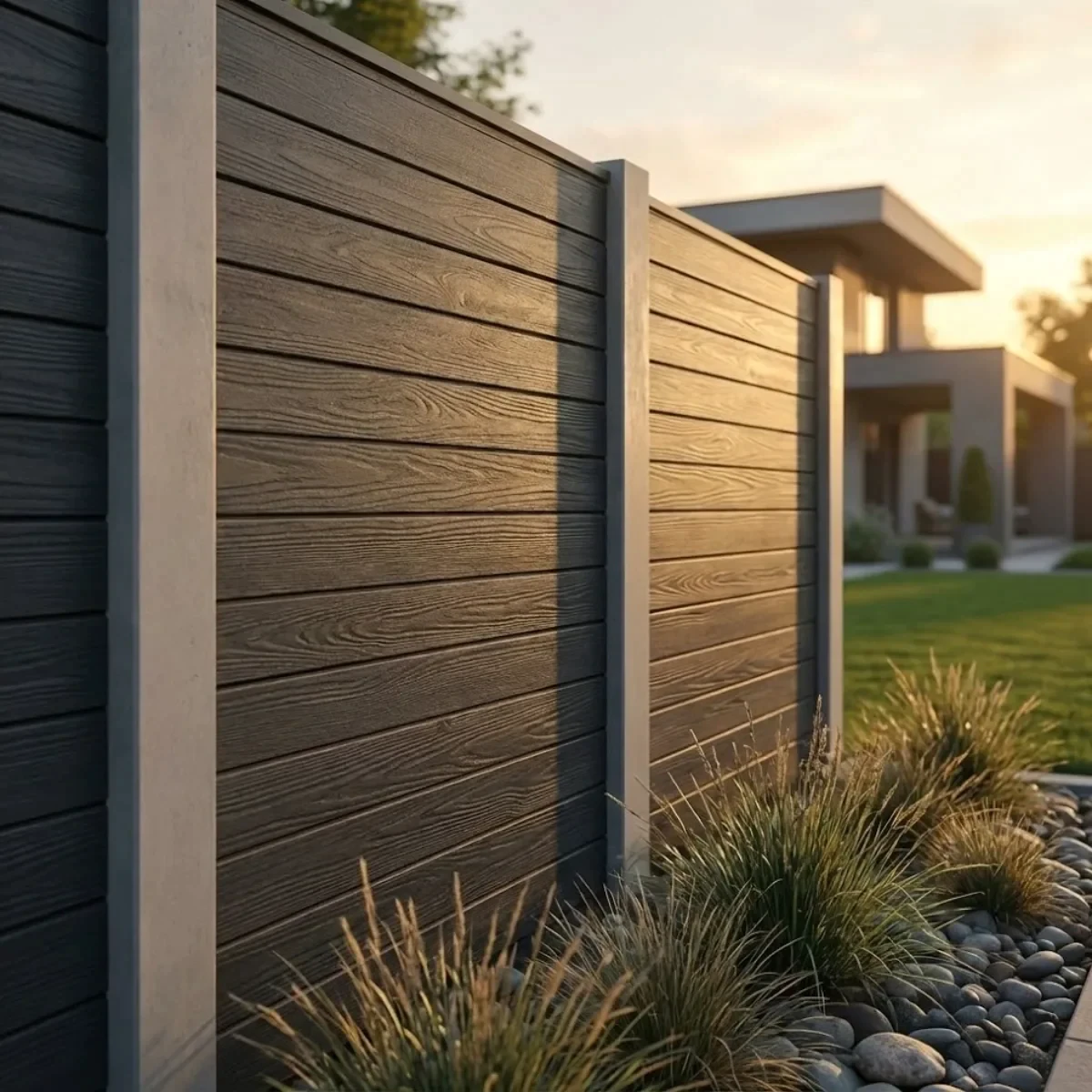 Etichete: gard WPC, textura lemn, plăci gard, gri închis, material compozit, rezistent uv
