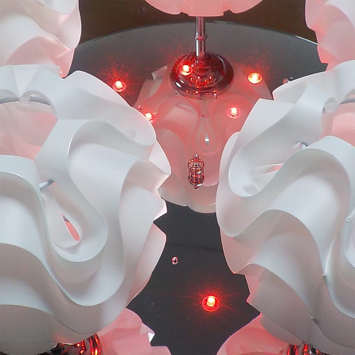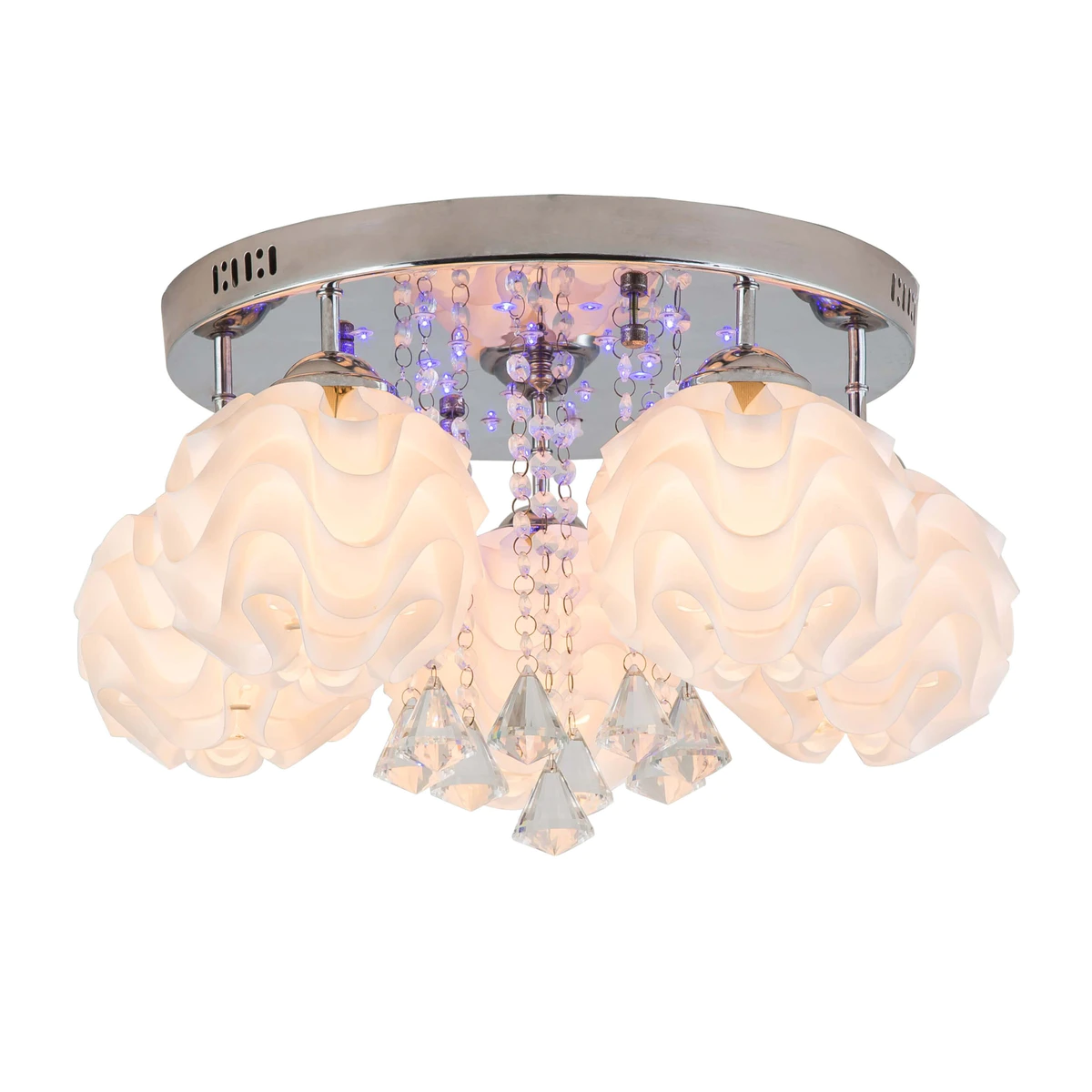 Performanța acestor plafoniere LED decorative se bazează pe tehnologia de iluminat hibridă ce combină sistemul tradițional cu becuri E14 și spoturile LED integrate care emit lumină în nuanțe de roșu, violet și albastru. Cadrul circular din metal argintiu suportă cele cinci abajururi globulare cu suprafață ondulată, creând o distribuție optimă a luminii în spațiul de instalare. Sistemul de telecomandă permite controlul independent al intensității luminoase și al combinațiilor de culori, oferind posibilitatea personalizării atmosferei în funcție de activitățile desfășurate sau momentul zilei.