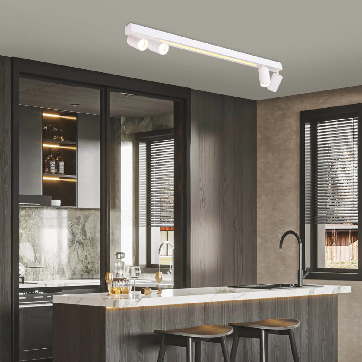 Da, datorită brațelor reglabile poți adapta fluxul luminos astfel încât să nu încarci vizual spațiul, iar designul subțire ajută la economisirea spațiului pe tavan.