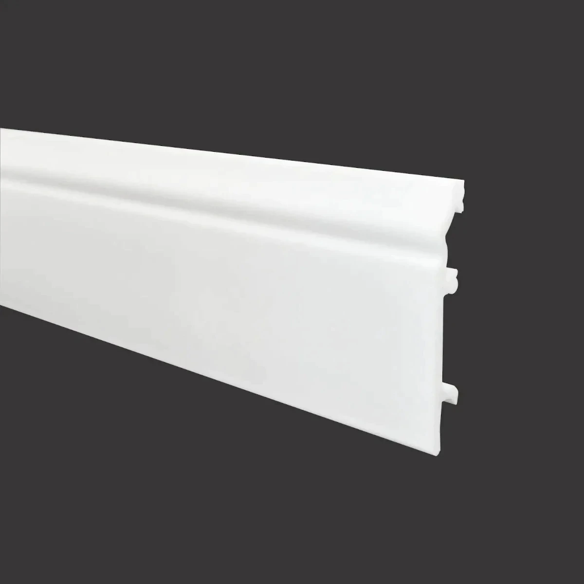 Plinta din polimer alba cu profil superior elegant combina rezistenta la umiditate cu designul rafinat pentru finisarea junctiunii pardoseala-perete. Suprafata neteda pregatita pentru vopsire si canalele discrete pentru cabluri o fac potrivita pentru renovarile moderne unde doriti un aspect curat si organizat.
