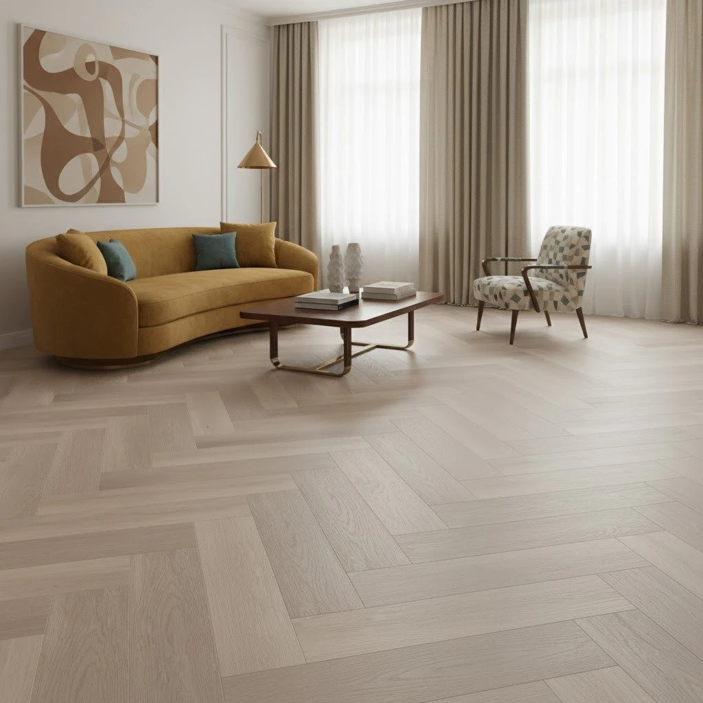 Conceput pentru a recrea autenticitatea pardoselilor de lemn masiv, designul Herringbone atrage privirile prin modelul sau iconic in forma de peste. Placile mari de 592 x 148 mm creeaza o impresie spatioasa si eleganta, iar textura si aspectul straturilor superioare de 0,55 mm ingrosime redau perfect frumusetea naturala a lemnului.