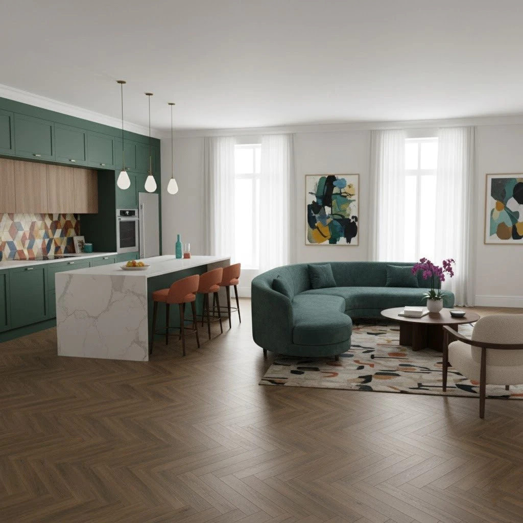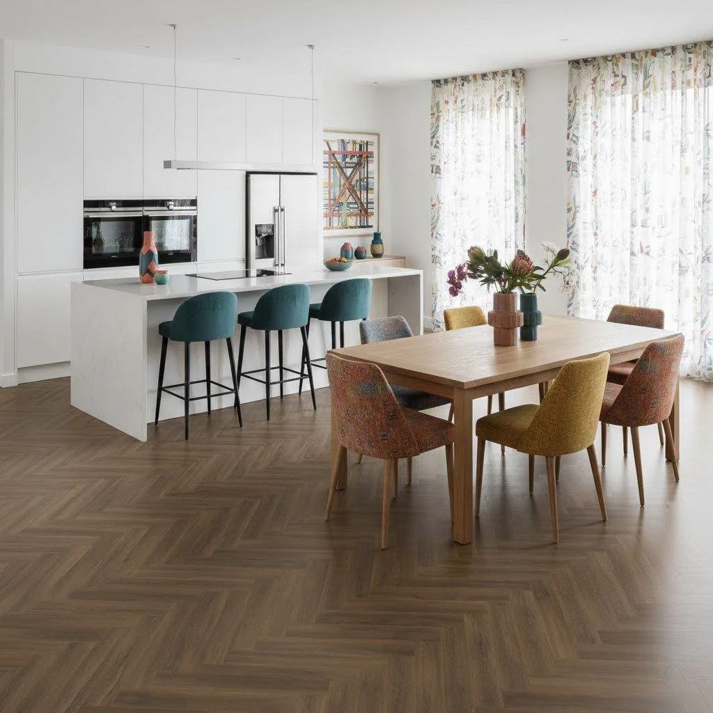 Modelul herringbone transformă pardoseala într-un element central al designului interior, creând o dinamică vizuală care ghidează privirea și structurează spațiul. În livingurile moderne, această pardoseală se armonizează cu mobilierul din lemn natural, textilele în nuanțe neutre și elementele decorative din metal. Nuanța Redwood complementează atât paletele calde (bej, ocru, terracotta), cât și cele reci (gri, albastru marin, verde închis), oferind flexibilitate în alegerea schemei cromatice.