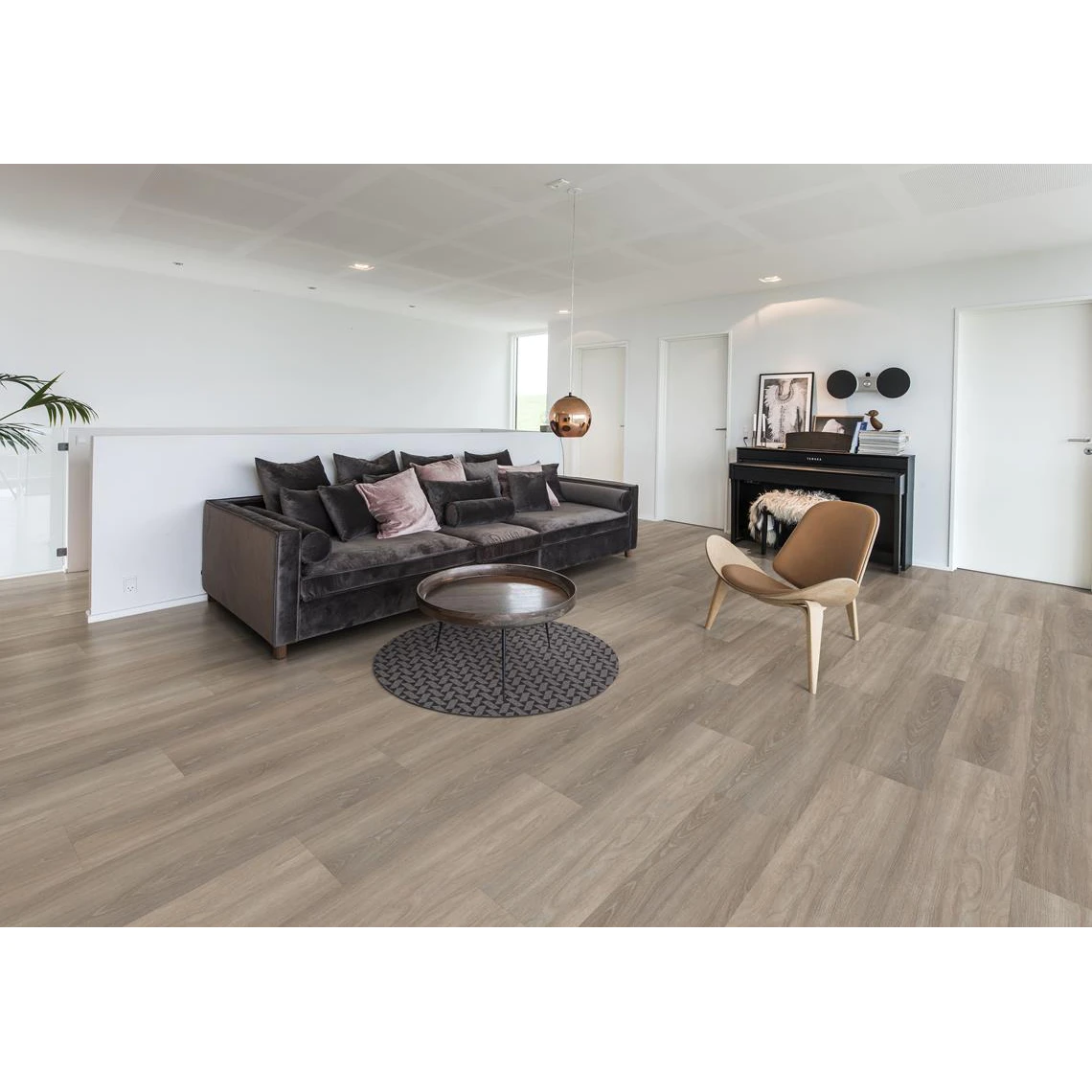 Această pardoseală transformă orice spațiu printr-o gamă cromatică rafinată, în care tonurile închise de nuc se îmbină armonios cu nuanțe subtile de maro și gri. Designul 1-strip creează un efect vizual continuu, oferind senzația unei pardoseli din lemn masiv, dar cu avantajele tehnologiei moderne. În livinguri și dormitoare, această nuanță închisă oferă o bază elegantă pentru mobilierul deschis la culoare, în timp ce în spațiile comerciale asigură o atmosferă profesională și caldă.
