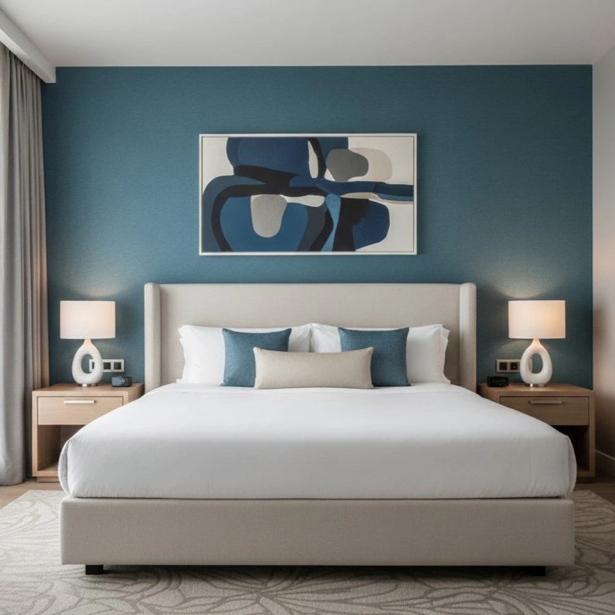 Răspuns: Această nuanță profundă este ideală pentru a crea un perete de accent, care adaugă adâncime și un punct focal de interes, fără a copleși spațiul. Într-o cameră bine iluminată sau în combinație cu mobilier deschis la culoare, podele și decorațiuni în tonuri neutre sau metalice, efectul va fi unul de eleganță și intimitate, nu de micșorare a spațiului.