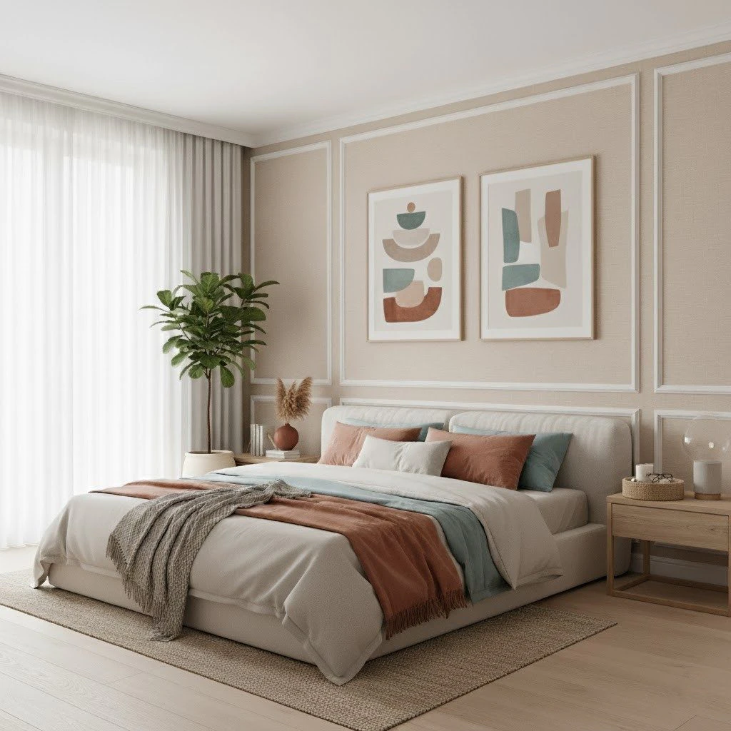Răspuns: Bejul este una dintre cele mai adaptabile culori neutre. Se integrează armonios în multiple stiluri, de la scandinav (cu lemn deschis și textile albe), la modern (cu accente negre și metalice) sau chiar clasic contemporan. Monotonia este evitată complet datorită texturii fine de in, care adaugă interes vizual și o senzație tactilă. Pereții devin un fundal calm, dar nu plictisitor, permițând mobilierului și operelor de artă să iasă în evidență.